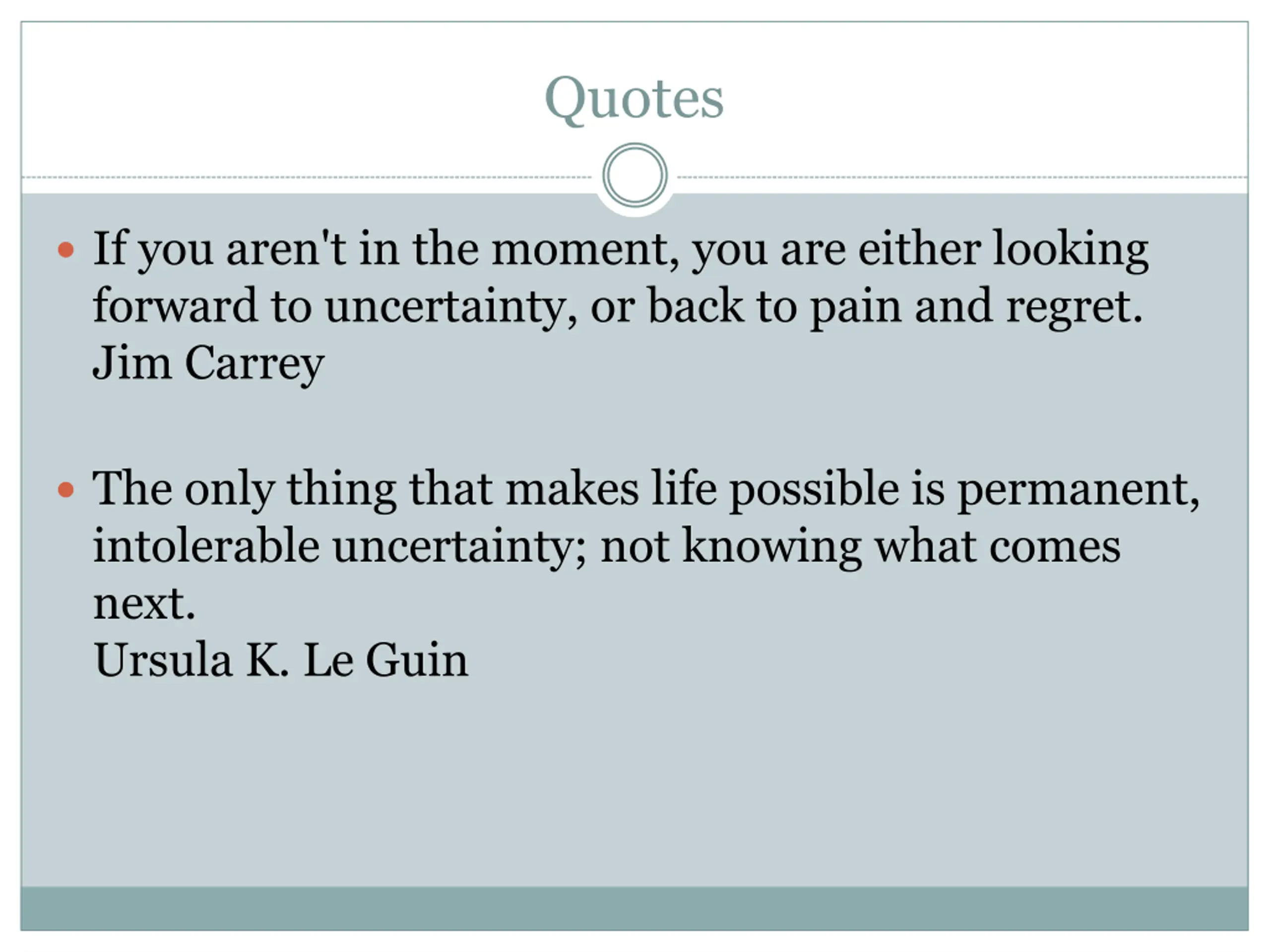 Quotes If you aren't in the moment, you are either looking forward to uncertainty, or back to pain and regret. Jim Carrey The only thing that makes life possible is permanent, intolerable uncertainty; not knowing what comes next. Ursula K. Le Guin