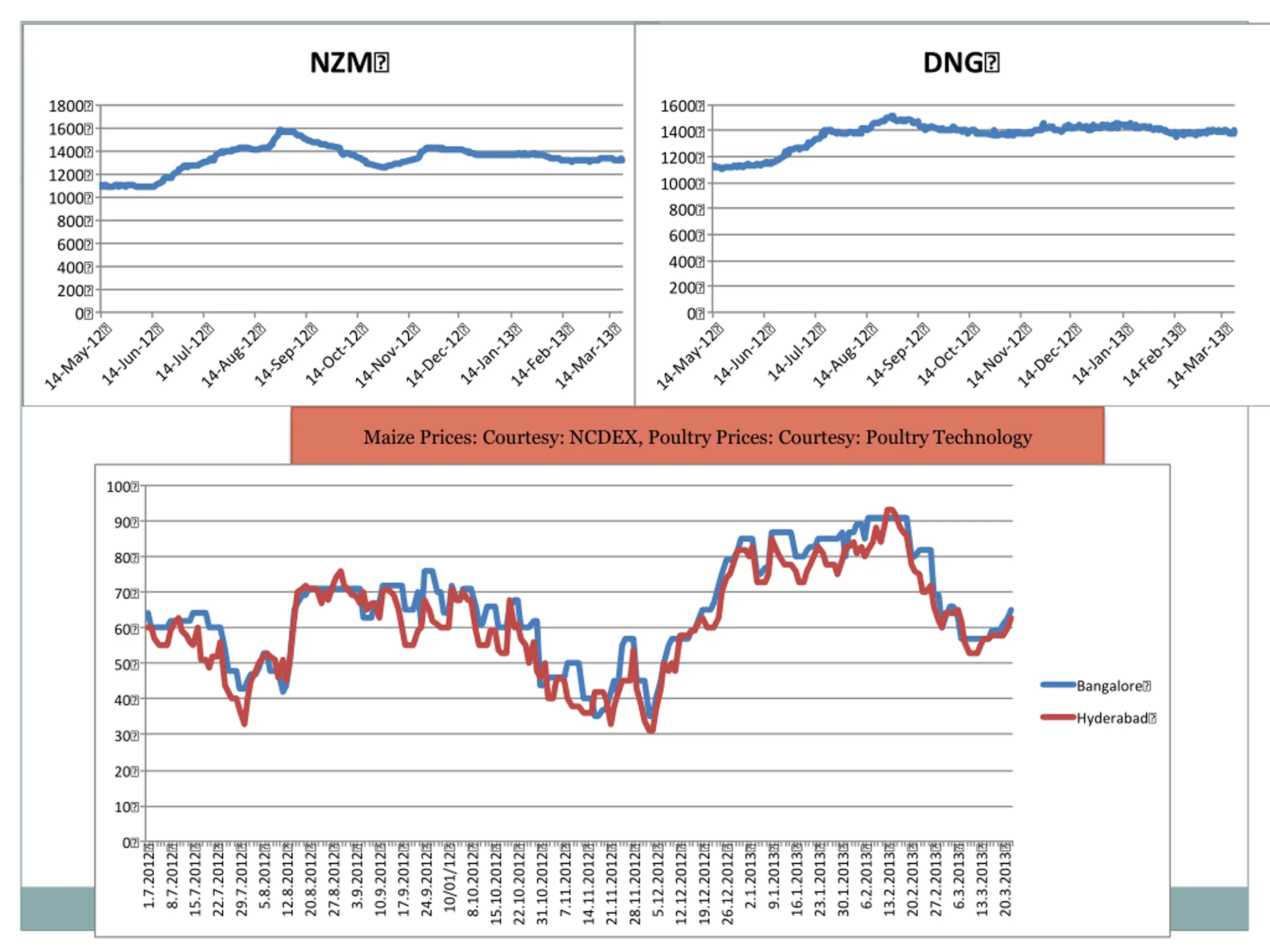 NZM? DNG? 1800? 1600? 1600? 1400? 1400? 1200? 1200? 1000? 1000? 800? 800? 600? 600? 400? 400? 200? 200? 0? 0? 14-Jul-12? 14-Sep-12? 14-Oct-12? 14-Nov-12? 14-Feb-13? 14-Mar-13? 14-Jul-12? 14-Sep-12? 14-Oct-12? 14-Nov-12? 14-Feb-13? 14-Mar-13? 14-May-12? 14-Aug-12? 14-May-12? 14-Aug-12? 14-Jun-12? 14-Jun-12? 14-Dec-12? 14-Dec-12? 14-Jan-13? 14-Jan-13? Maize Prices: Courtesy: NCDEX, Poultry Prices: Courtesy: Poultry Technology 100? 90? 80? 70? 60? 50? Bangalore? 40? Hyderabad? 30? 20? 10? 0? 15.7.2012? 22.7.2012? 29.7.2012? 12.8.2012? 20.8.2012? 27.8.2012? 10.9.2012? 17.9.2012? 24.9.2012? 10/01/12? 8.10.2012? 7.11.2012? 5.12.2012? 16.1.2013? 23.1.2013? 30.1.2013? 13.2.2013? 20.2.2013? 27.2.2013? 13.3.2013? 20.3.2013? 15.10.2012? 22.10.2012? 31.10.2012? 14.11.2012? 21.11.2012? 28.11.2012? 12.12.2012? 19.12.2012? 26.12.2012? 1.7.2012? 8.7.2012? 5.8.2012? 3.9.2012? 2.1.2013? 9.1.2013? 6.2.2013? 6.3.2013?