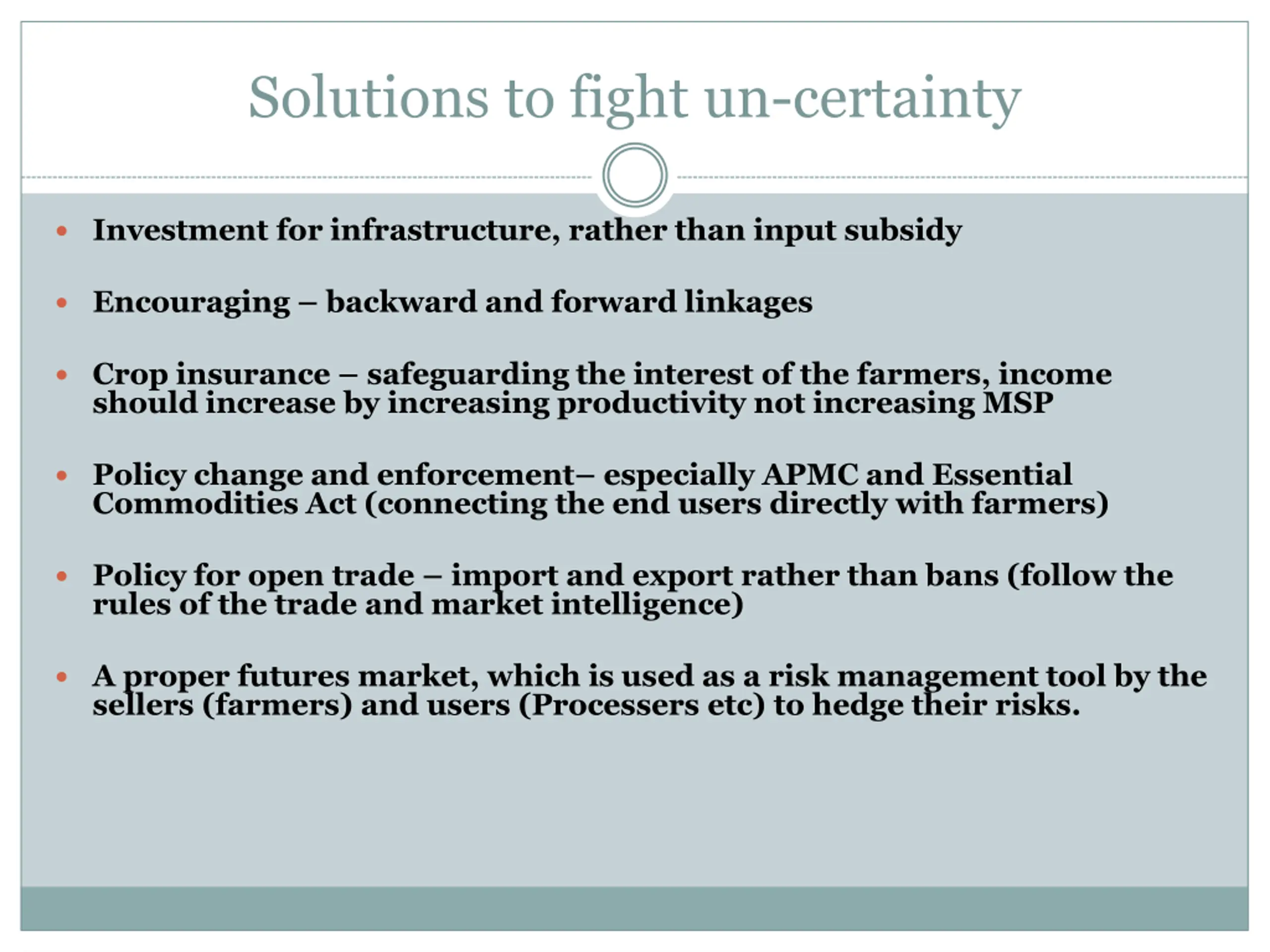 Solutions to fight un-certainty Investment for infrastructure, rather than input subsidy Encouraging backward and forward linkages Crop insurance safeguarding the interest of the farmers, income should increase by increasing productivity not increasing MSP Policy change and enforcement especially APMC and Essential Commodities Act (connecting the end users directly with farmers) Policy for open trade import and export rather than bans (follow the rules of the trade and market intelligence) A proper futures market, which is used as a risk management tool by the sellers (farmers) and users (Processers etc) to hedge their risks.