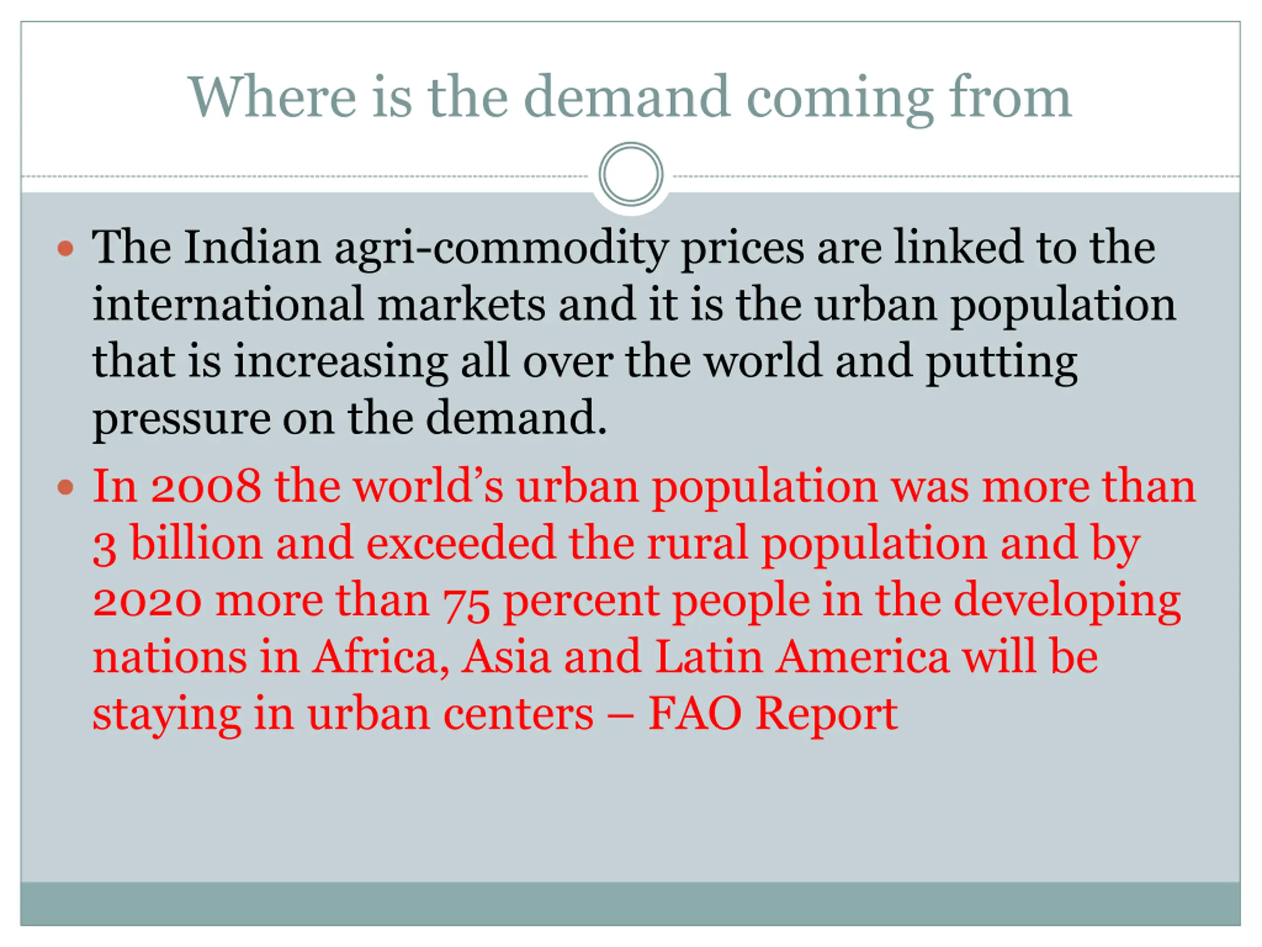 Where is the demand coming from The Indian agri-commodity prices are linked to the international markets and it is the urban population that is increasing all over the world and putting pressure on the demand. In 2008 the world s urban population was more than 3 billion and exceeded the rural population and by 2020 more than 75 percent people in the developing nations in Africa, Asia and Latin America will be staying in urban centers FAO Report