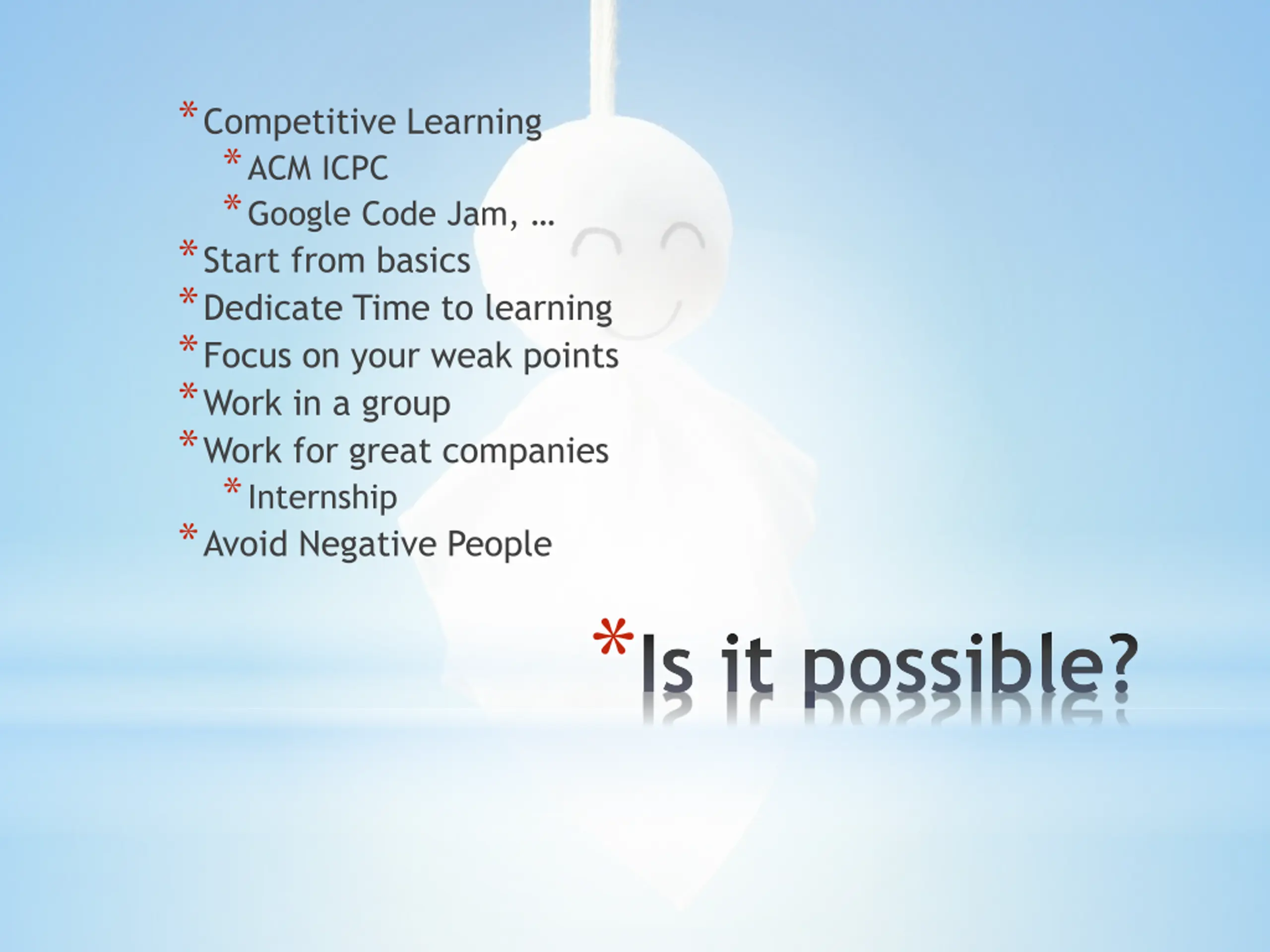 *Competitive Learning *ACM ICPC *Google Code Jam, *Start from basics *Dedicate Time to learning *Focus on your weak points *Work in a group *Work for great companies *Internship *Avoid Negative People *Is it possible?