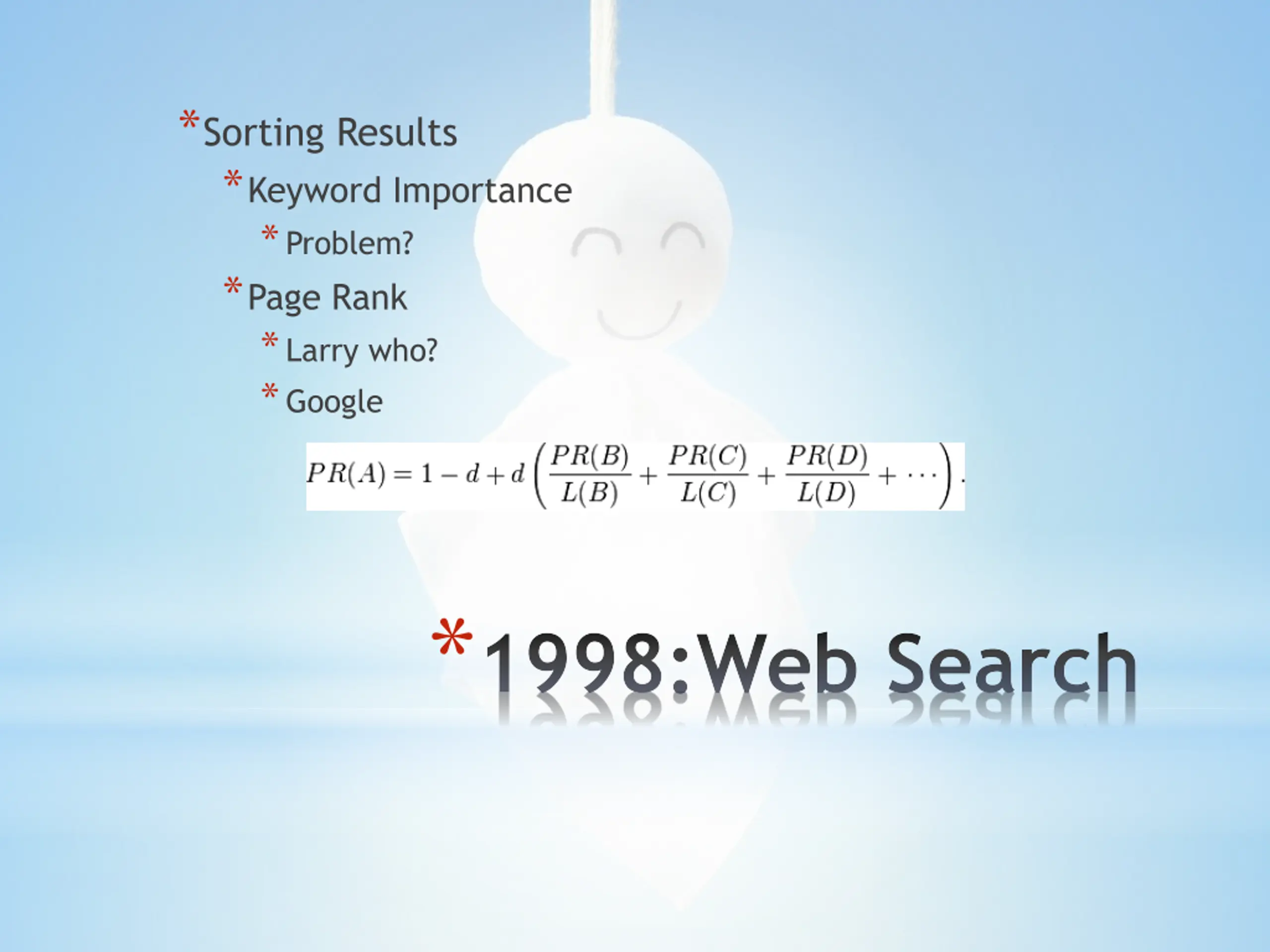 *Sorting Results *Keyword Importance *Problem? *Page Rank *Larry who? *Google *1998:Web Search