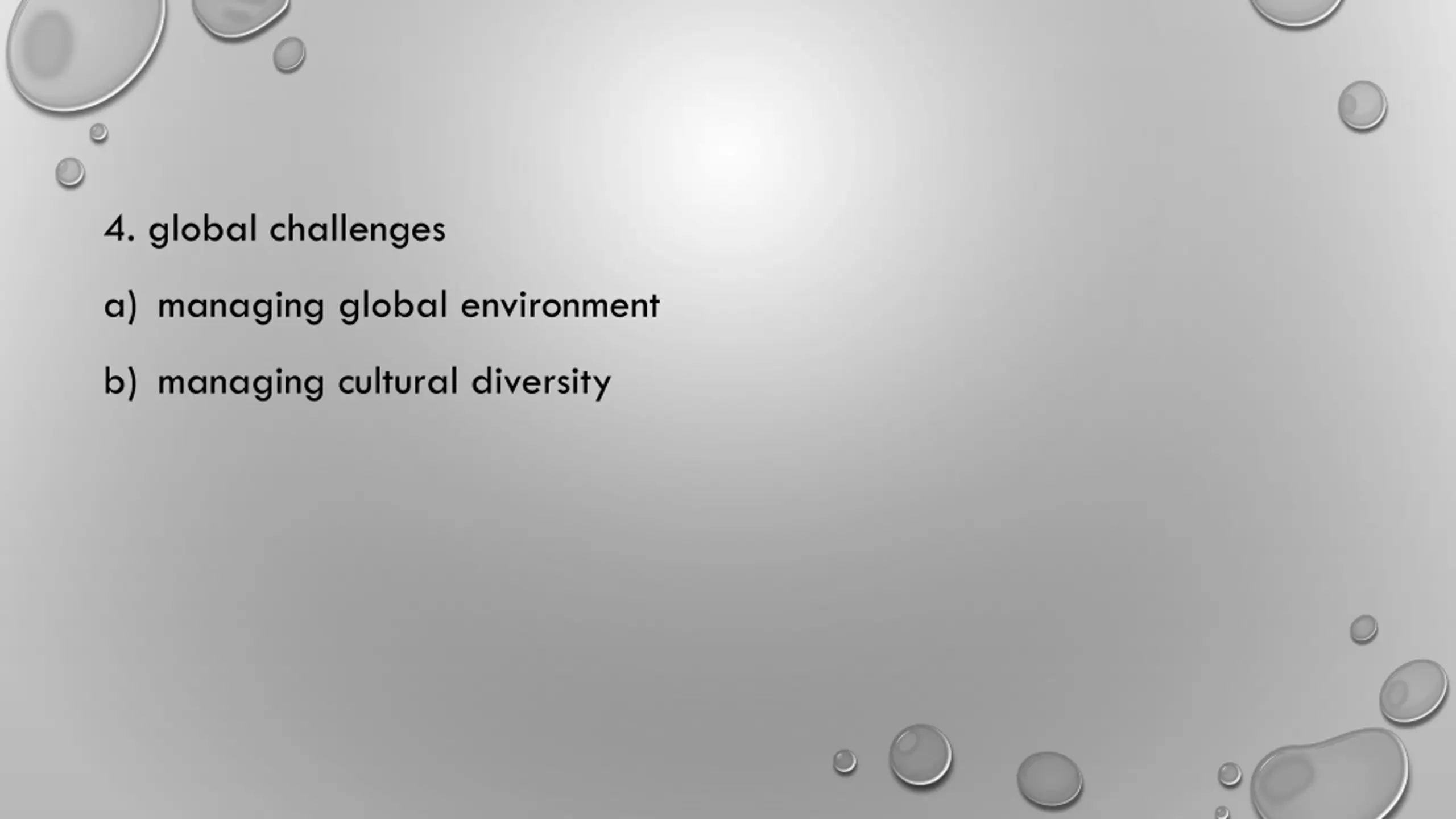 4. global challenges a) managing global environment b) managing cultural diversity