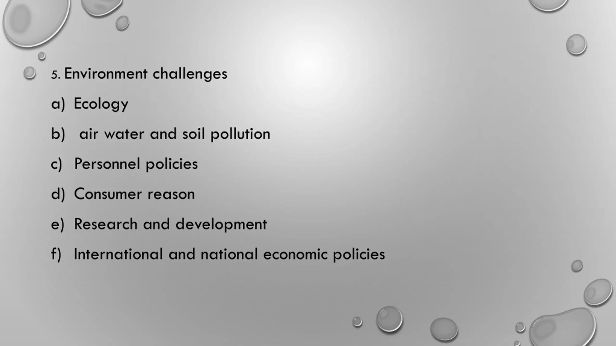 5. Environment challenges a) Ecology b) air water and soil pollution c) Personnel policies d) Consumer reason e) Research and development f) International and national economic policies