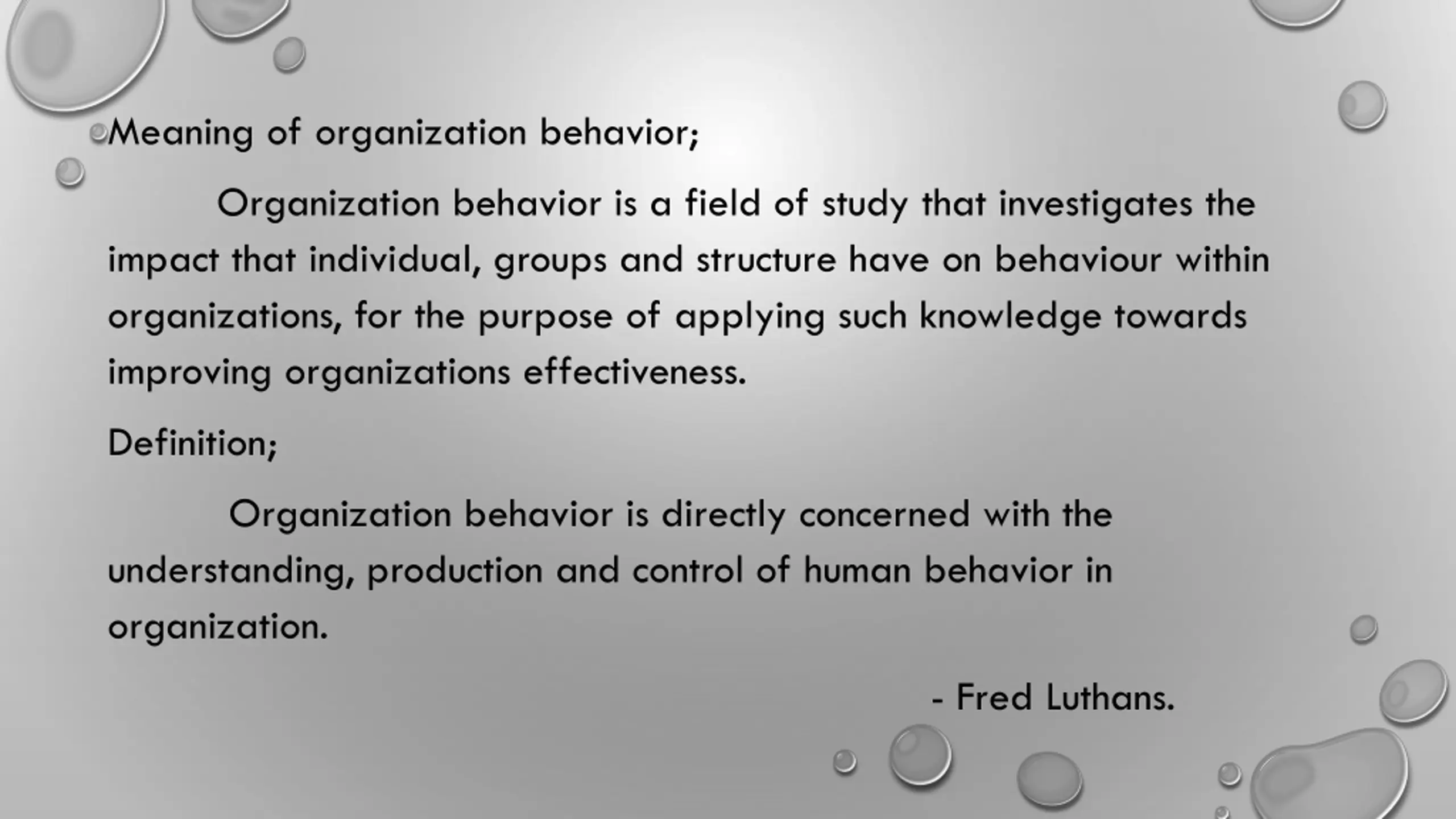 Meaning of organization behavior; Organization behavior is a field of study that investigates the impact that individual, groups and structure have on behaviour within organizations, for the purpose of applying such knowledge towards improving organizations effectiveness. Definition; Organization behavior is directly concerned with the understanding, production and control of human behavior in organization. - Fred Luthans.