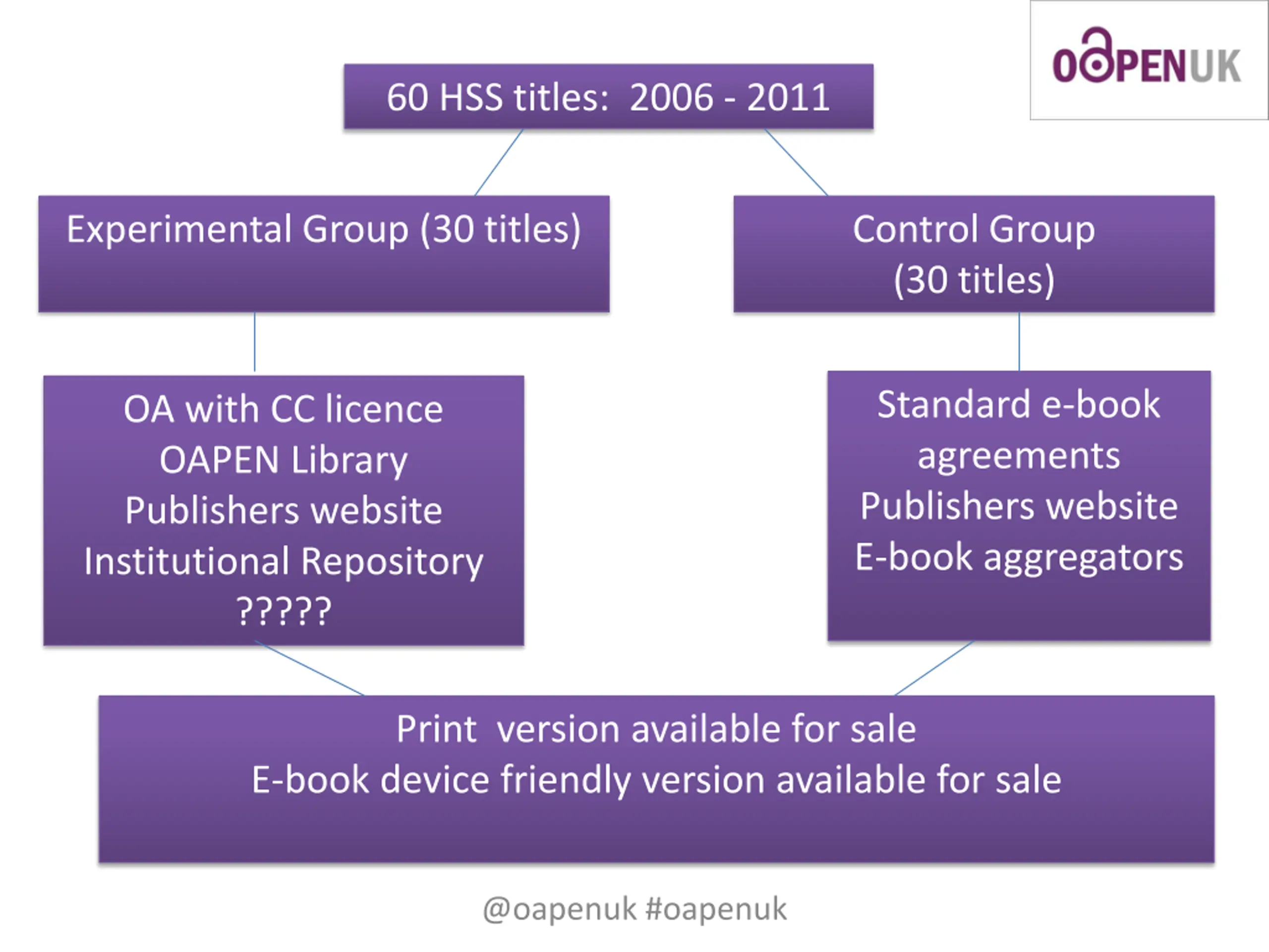 60 HSS titles: 2006 - 2011 Experimental Group (30 titles) Control Group (30 titles) Standard e-book agreements Publishers website E-book aggregators OA with CC licence OAPEN Library Publishers website Institutional Repository ????? Print version available for sale E-book device friendly version available for sale @oapenuk #oapenuk