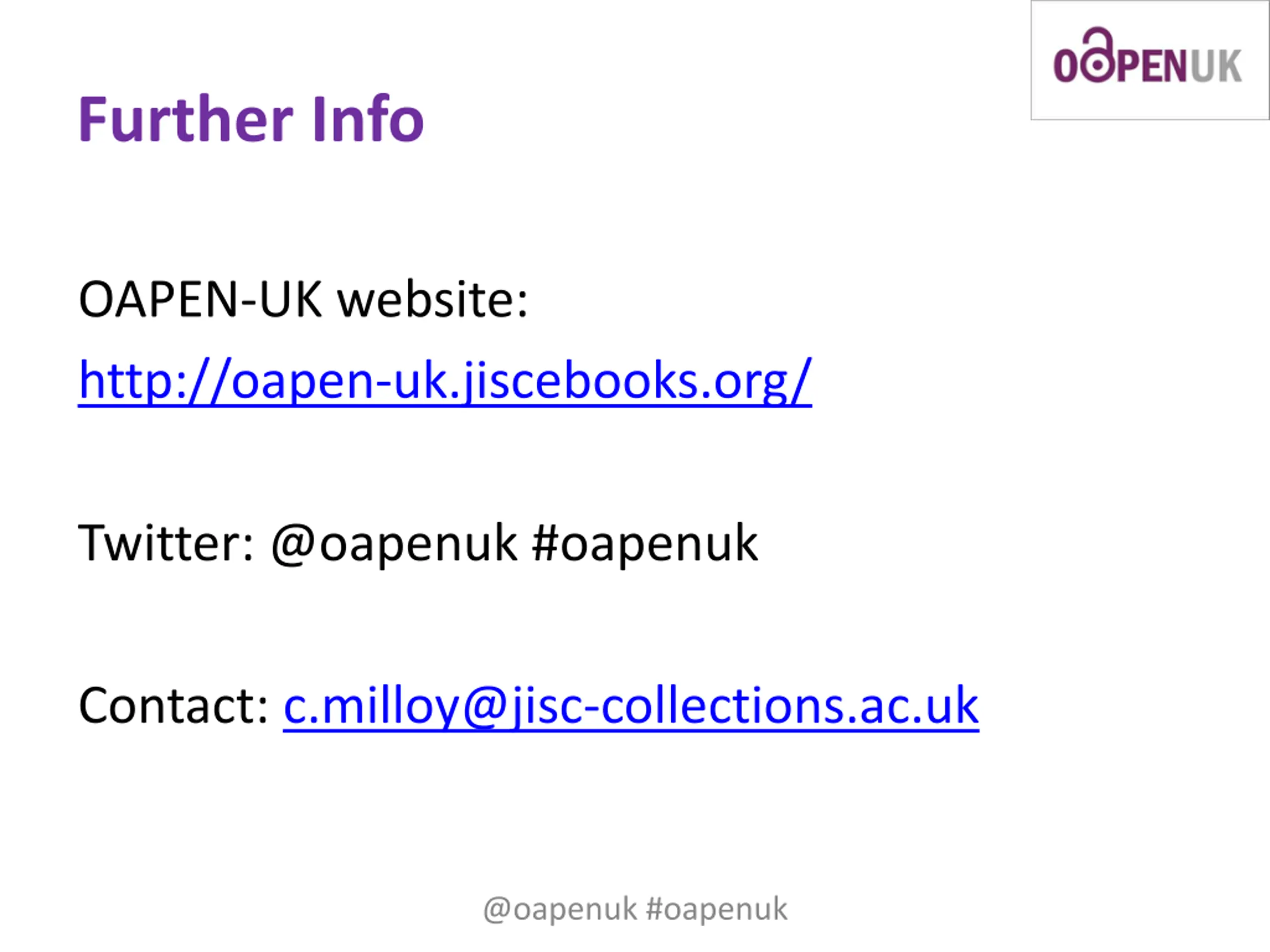 Further Info OAPEN-UK website: http://oapen-uk.jiscebooks.org/ Twitter: @oapenuk #oapenuk Contact: c.milloy@jisc-collections.ac.uk @oapenuk #oapenuk