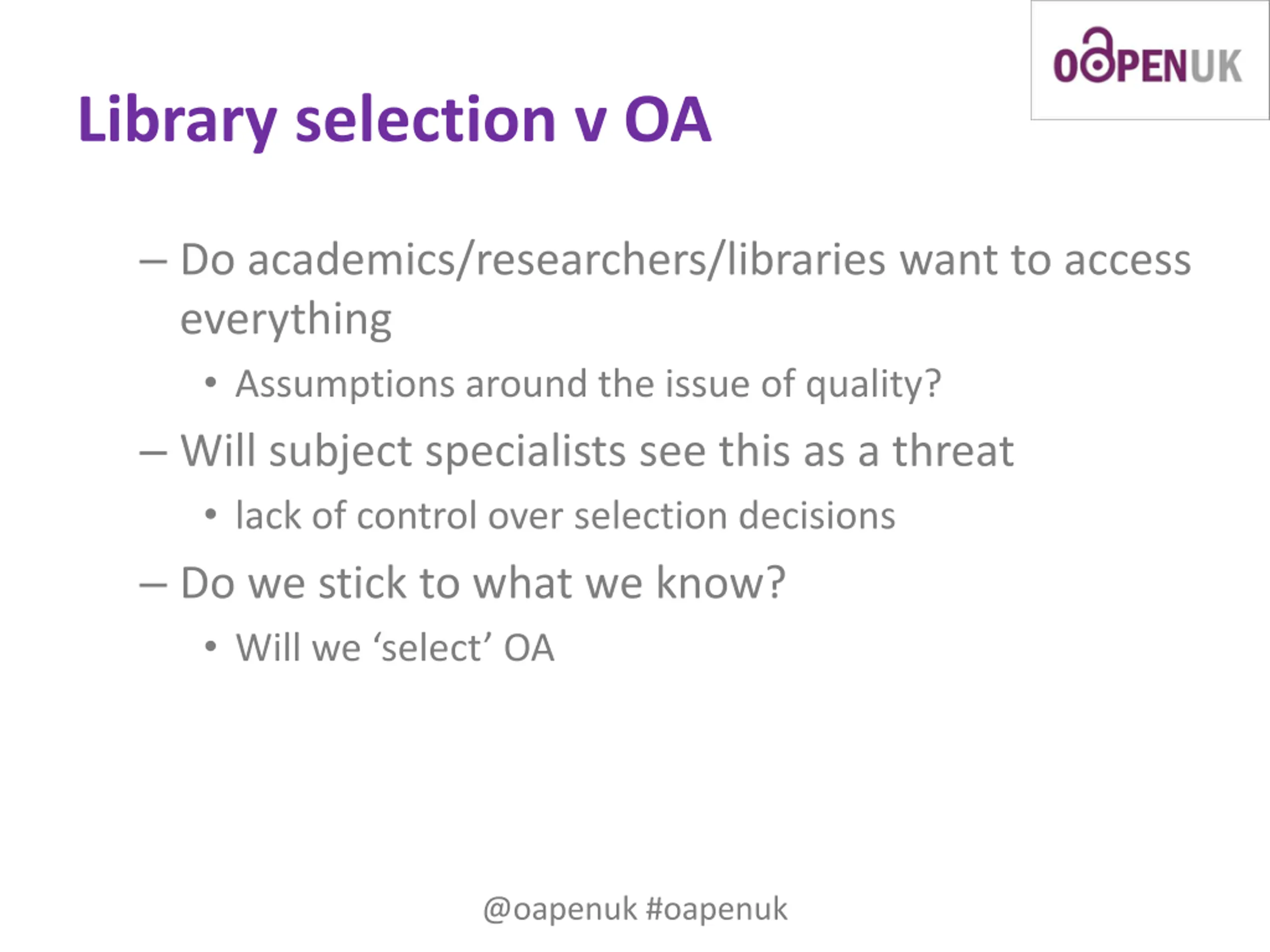 Library selection v OA Do academics/researchers/libraries want to access everything Assumptions around the issue of quality? Will subject specialists see this as a threat lack of control over selection decisions Do we stick to what we know? Will we select OA @oapenuk #oapenuk