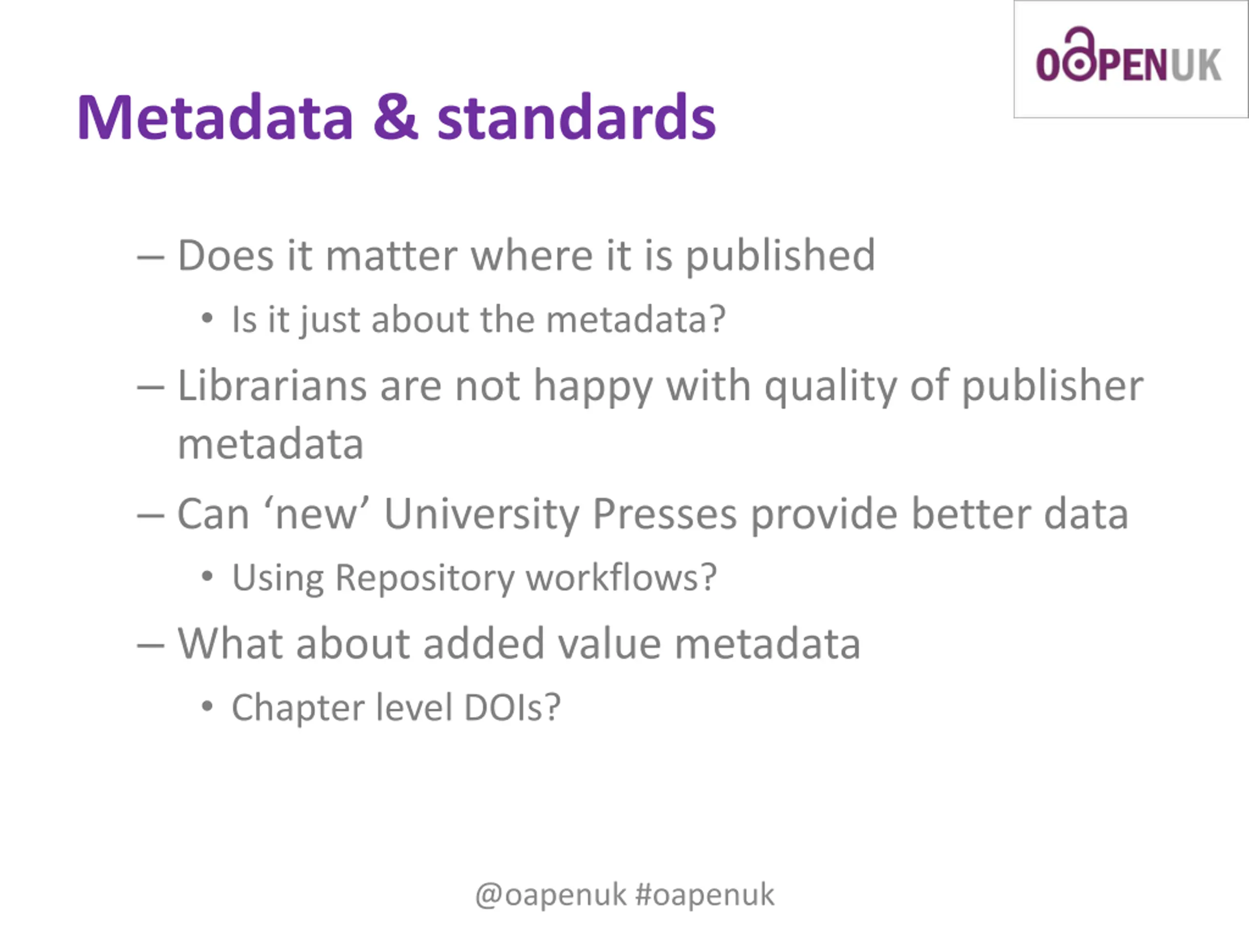 Metadata & standards Does it matter where it is published Is it just about the metadata? Librarians are not happy with quality of publisher metadata Can new University Presses provide better data Using Repository workflows? What about added value metadata Chapter level DOIs? @oapenuk #oapenuk