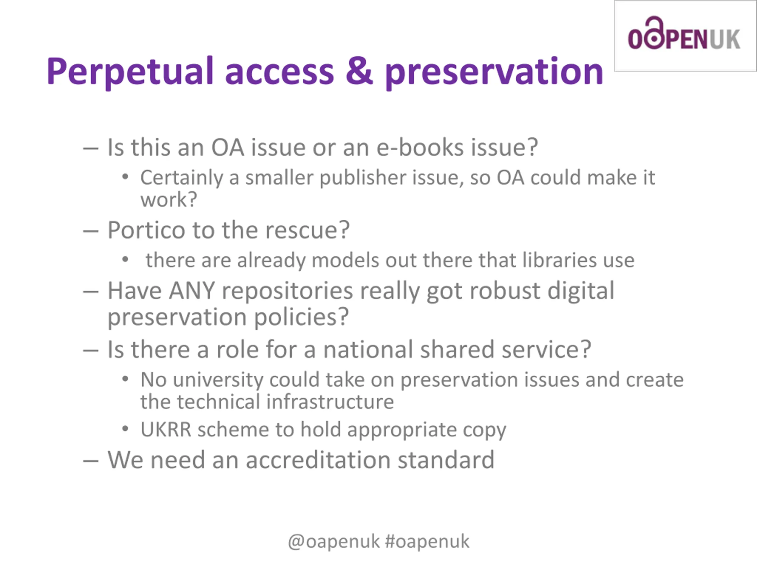 Perpetual access & preservation Is this an OA issue or an e-books issue? Certainly a smaller publisher issue, so OA could make it work? Portico to the rescue? there are already models out there that libraries use Have ANY repositories really got robust digital preservation policies? Is there a role for a national shared service? No university could take on preservation issues and create the technical infrastructure UKRR scheme to hold appropriate copy We need an accreditation standard @oapenuk #oapenuk