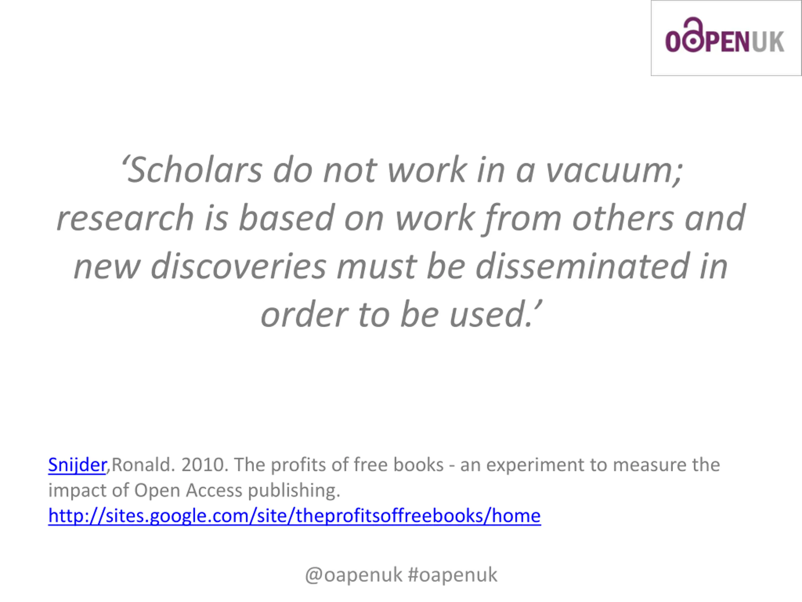 Scholars do not work in a vacuum; research is based on work from others and new discoveries must be disseminated in order to be used. Snijder,Ronald. 2010. The profits of free books - an experiment to measure the impact of Open Access publishing. http://sites.google.com/site/theprofitsoffreebooks/home @oapenuk #oapenuk