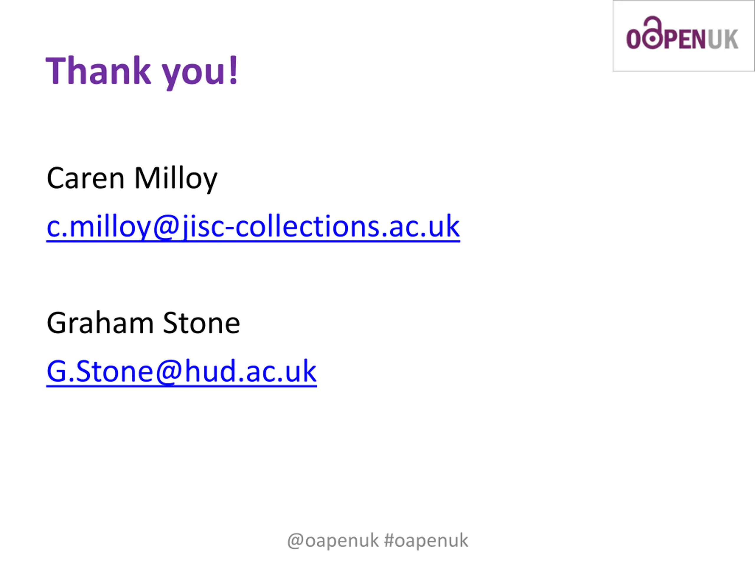 Thank you! Caren Milloy c.milloy@jisc-collections.ac.uk Graham Stone G.Stone@hud.ac.uk @oapenuk #oapenuk