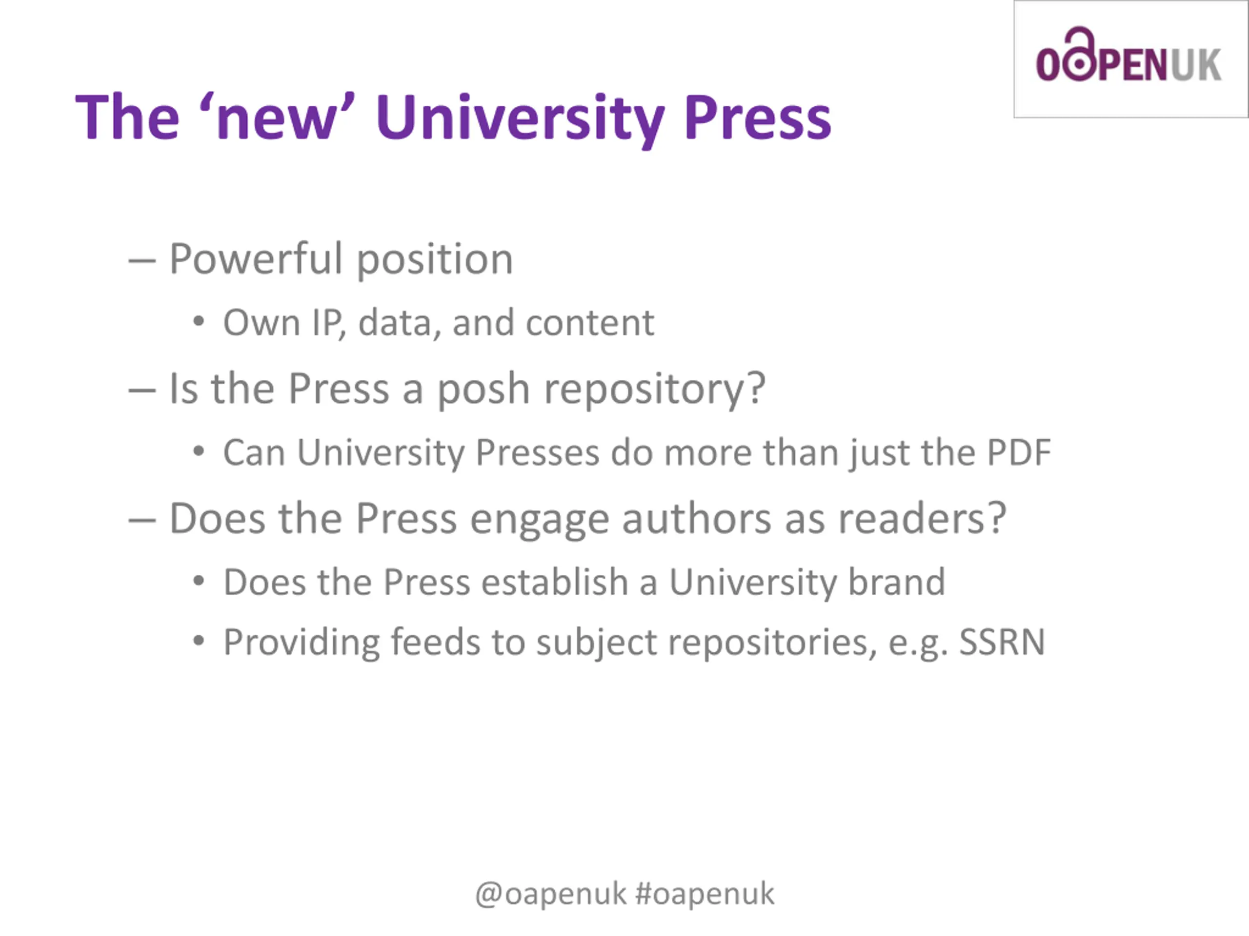 The new University Press Powerful position Own IP, data, and content Is the Press a posh repository? Can University Presses do more than just the PDF Does the Press engage authors as readers? Does the Press establish a University brand Providing feeds to subject repositories, e.g. SSRN @oapenuk #oapenuk