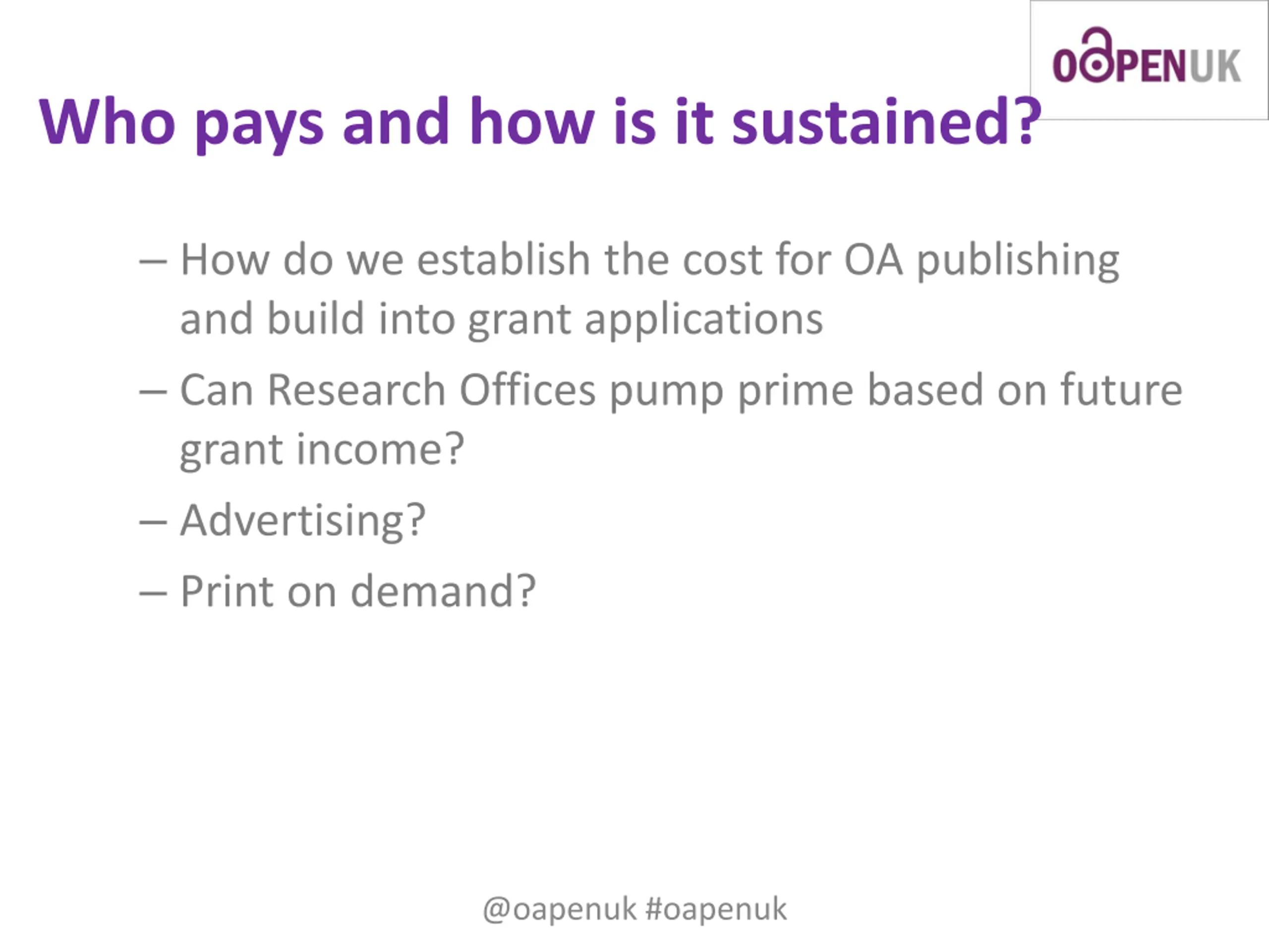 Who pays and how is it sustained? How do we establish the cost for OA publishing and build into grant applications Can Research Offices pump prime based on future grant income? Advertising? Print on demand? @oapenuk #oapenuk