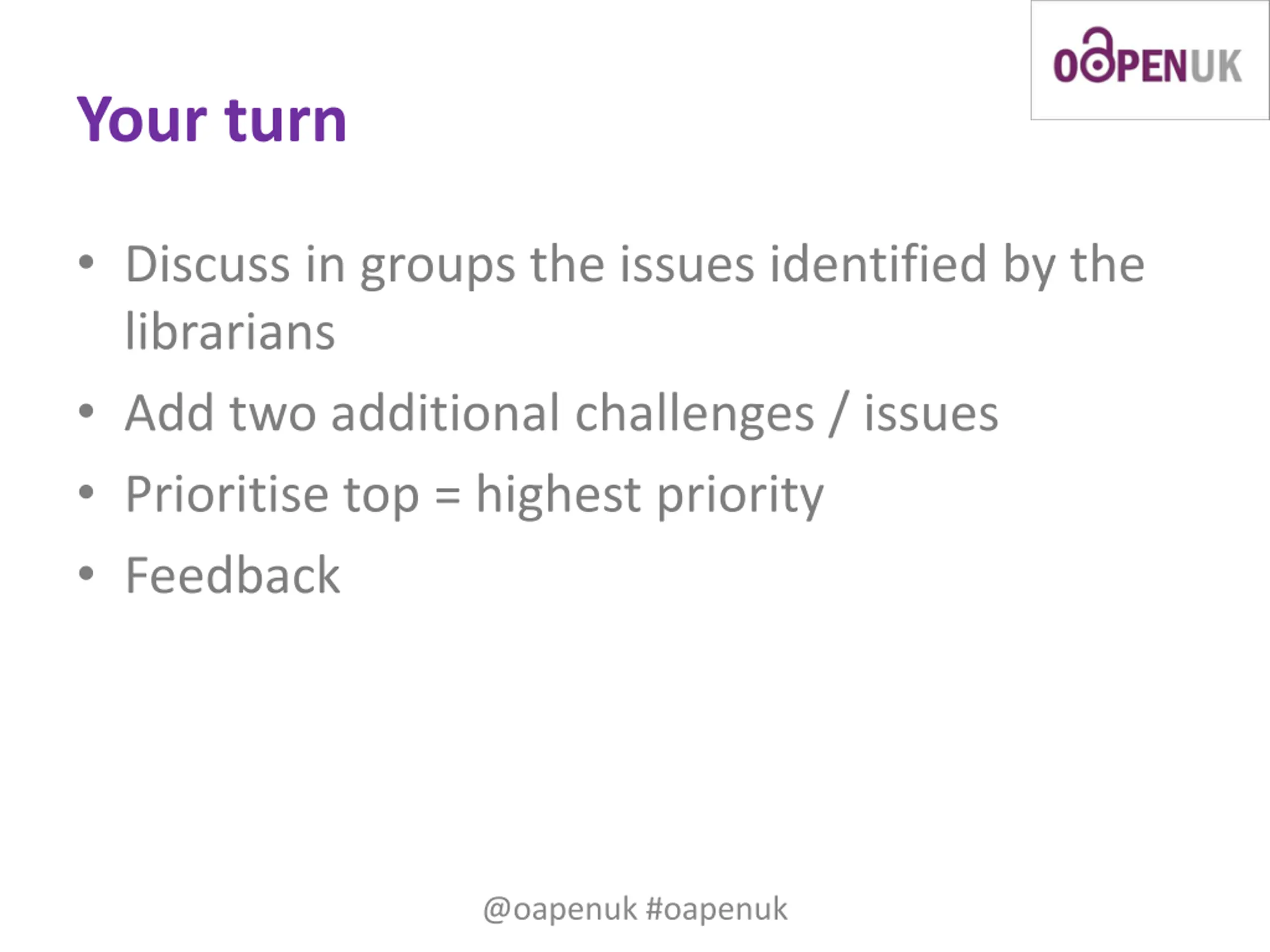 Your turn Discuss in groups the issues identified by the librarians Add two additional challenges / issues Prioritise top = highest priority Feedback @oapenuk #oapenuk