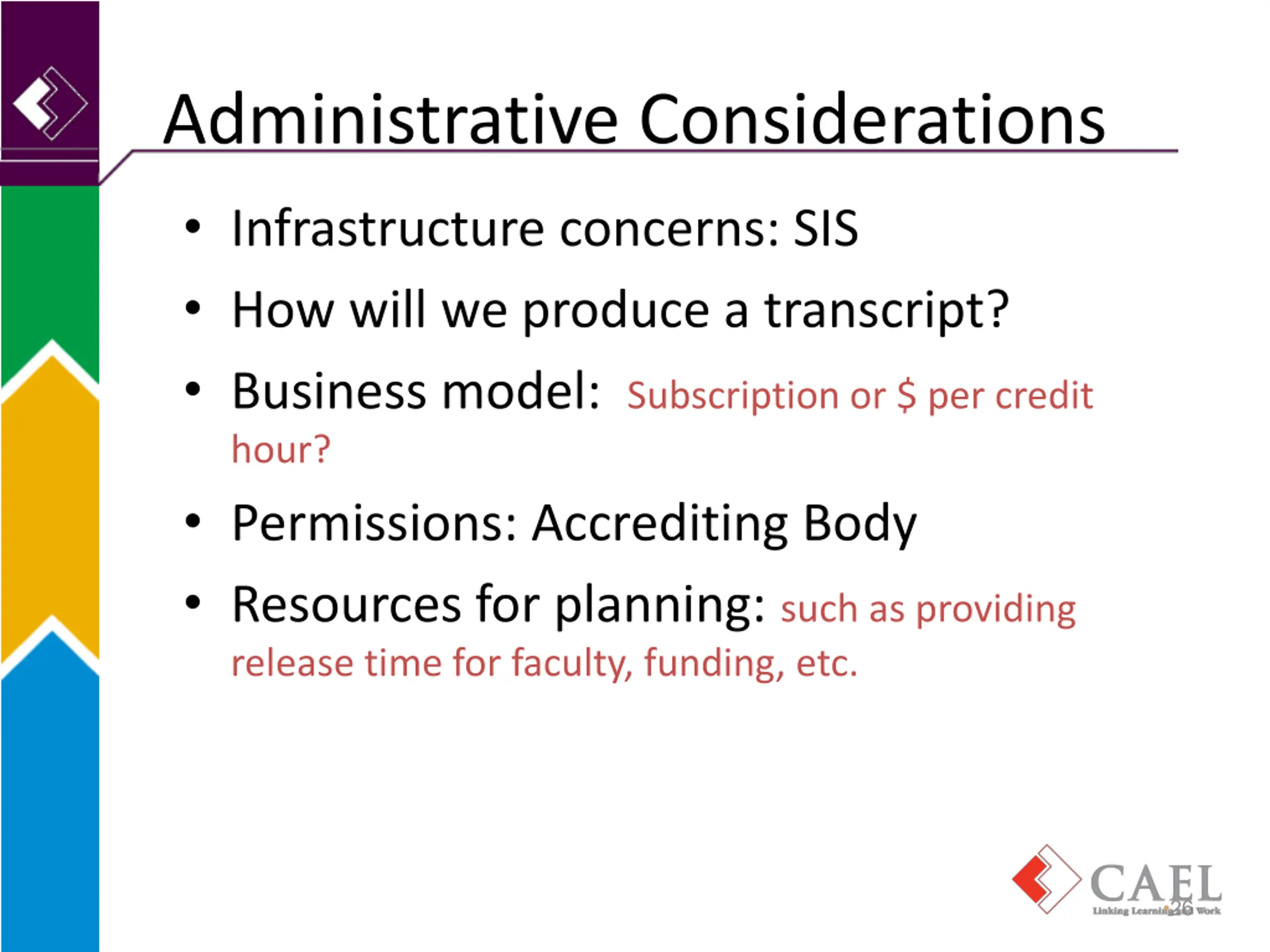Administrative Considerations Infrastructure concerns: SIS How will we produce a transcript? Business model: Subscription or $ per credit hour? Permissions: Accrediting Body Resources for planning: such as providing release time for faculty, funding, etc. 26