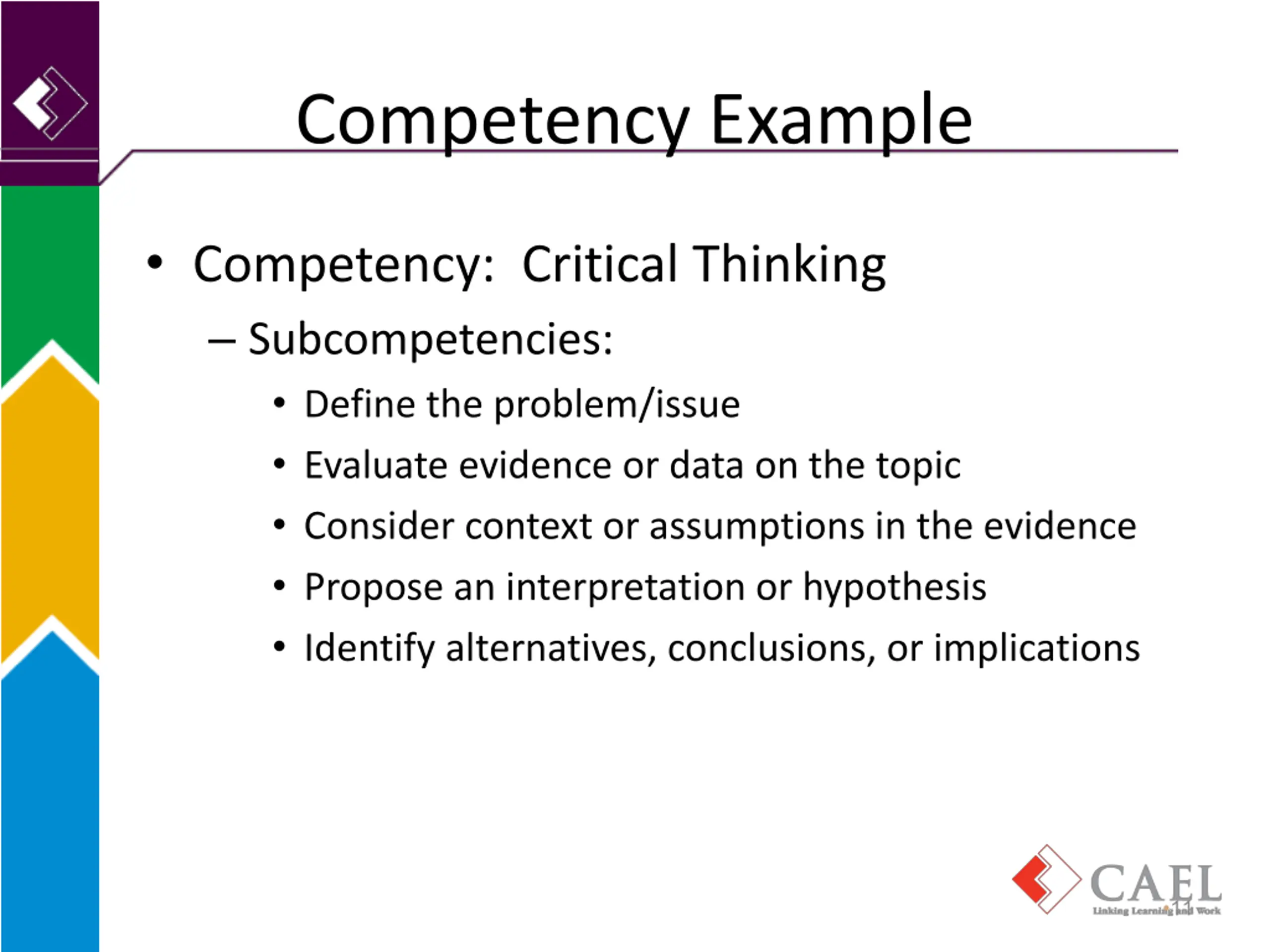 Competency Example Competency: Critical Thinking Subcompetencies: Define the problem/issue Evaluate evidence or data on the topic Consider context or assumptions in the evidence Propose an interpretation or hypothesis Identify alternatives, conclusions, or implications 11