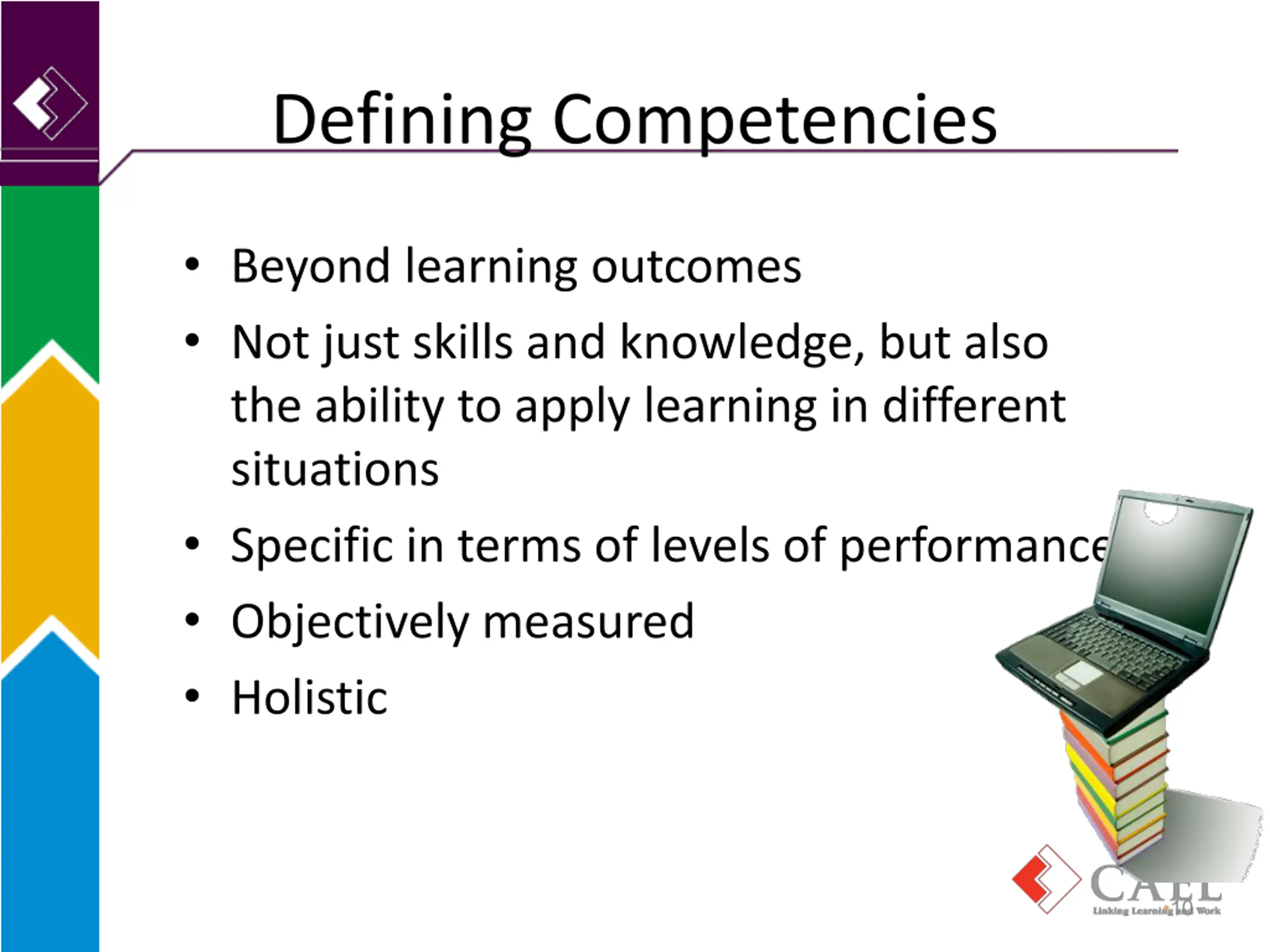 Defining Competencies Beyond learning outcomes Not just skills and knowledge, but also the ability to apply learning in different situations Specific in terms of levels of performance Objectively measured Holistic 10