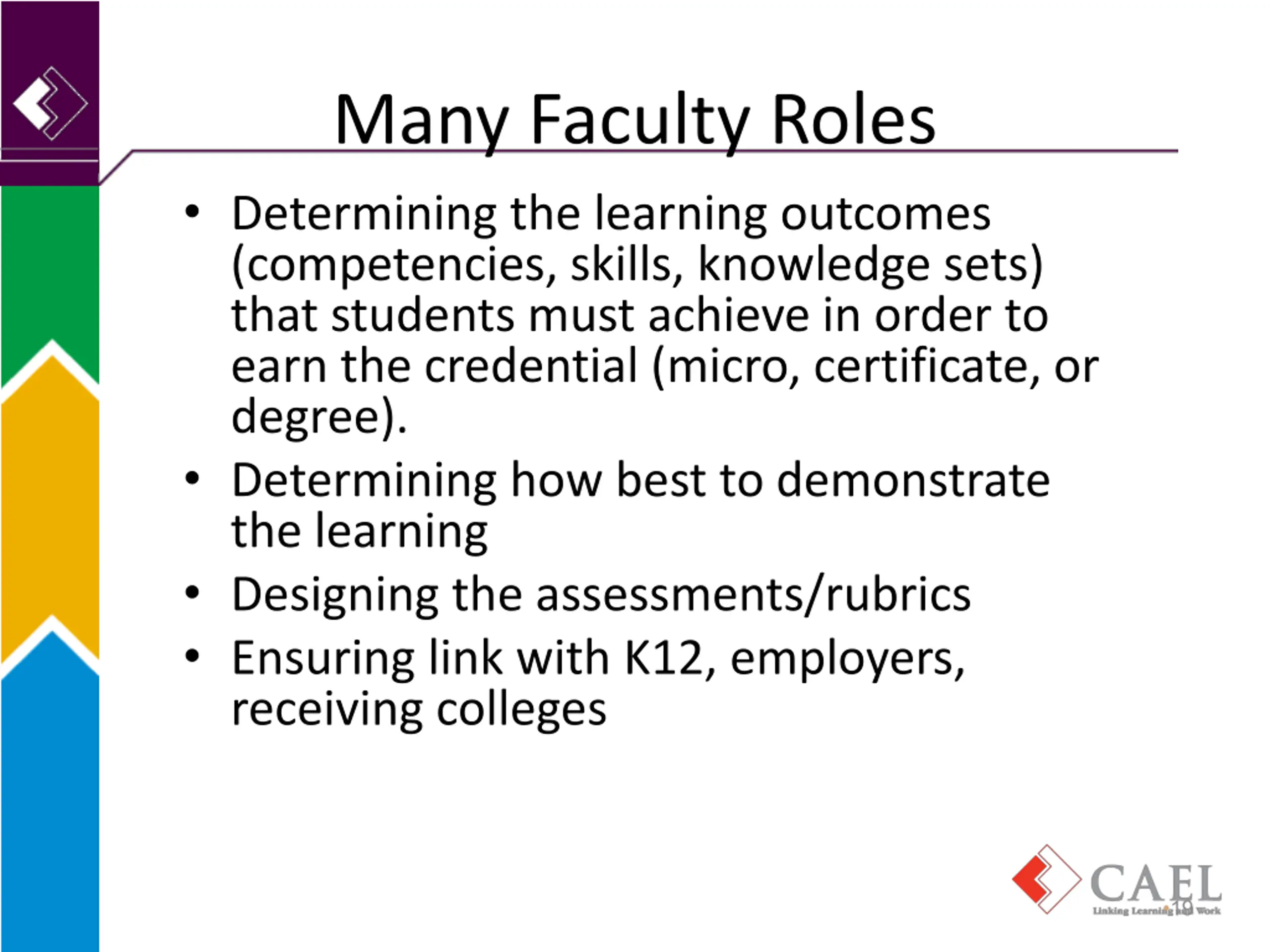 Many Faculty Roles Determining the learning outcomes (competencies, skills, knowledge sets) that students must achieve in order to earn the credential (micro, certificate, or degree). Determining how best to demonstrate the learning Designing the assessments/rubrics Ensuring link with K12, employers, receiving colleges 19