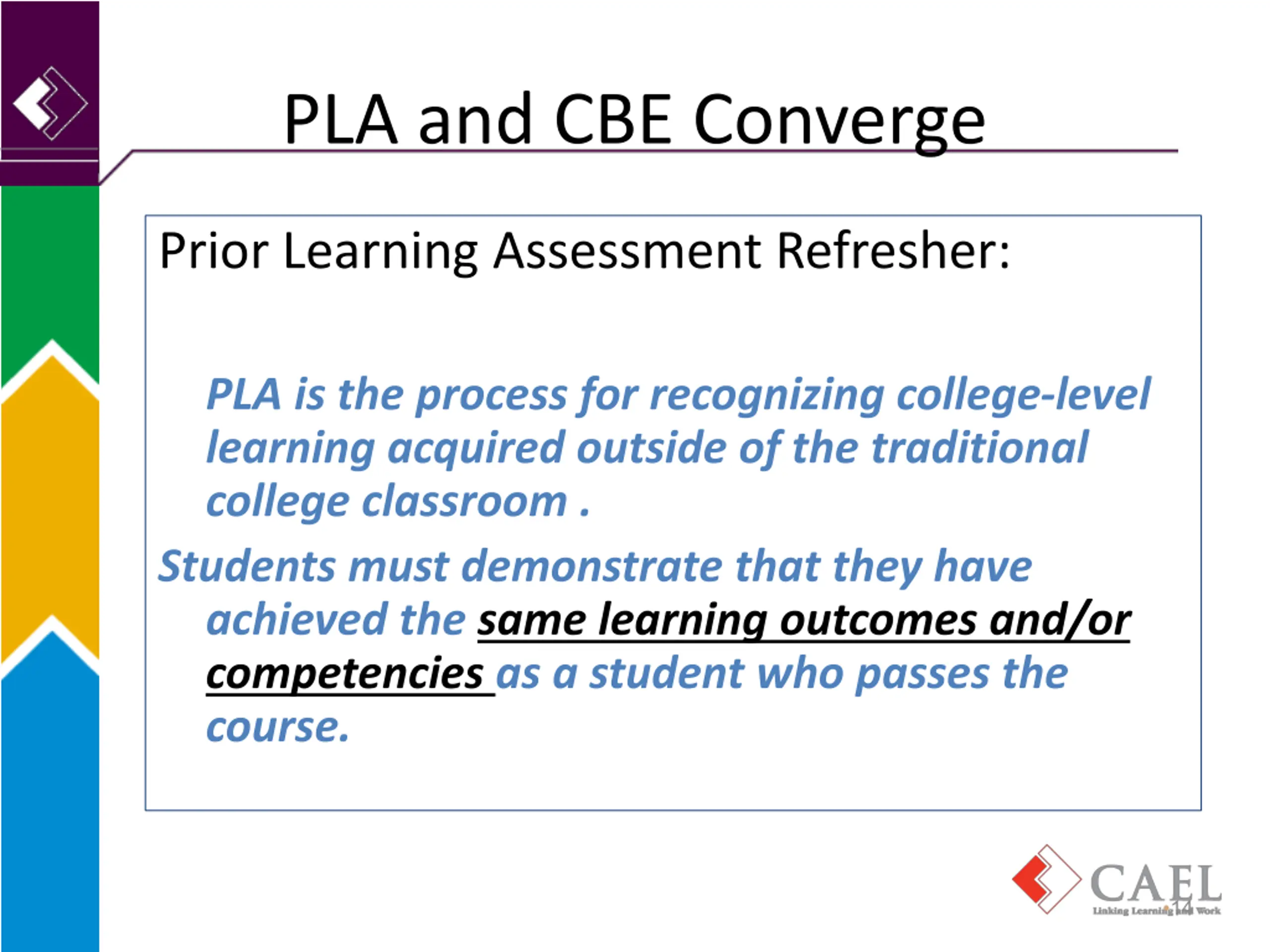 PLA and CBE Converge Prior Learning Assessment Refresher: PLA is the process for recognizing college-level learning acquired outside of the traditional college classroom . Students must demonstrate that they have achieved the same learning outcomes and/or competencies as a student who passes the course. 14