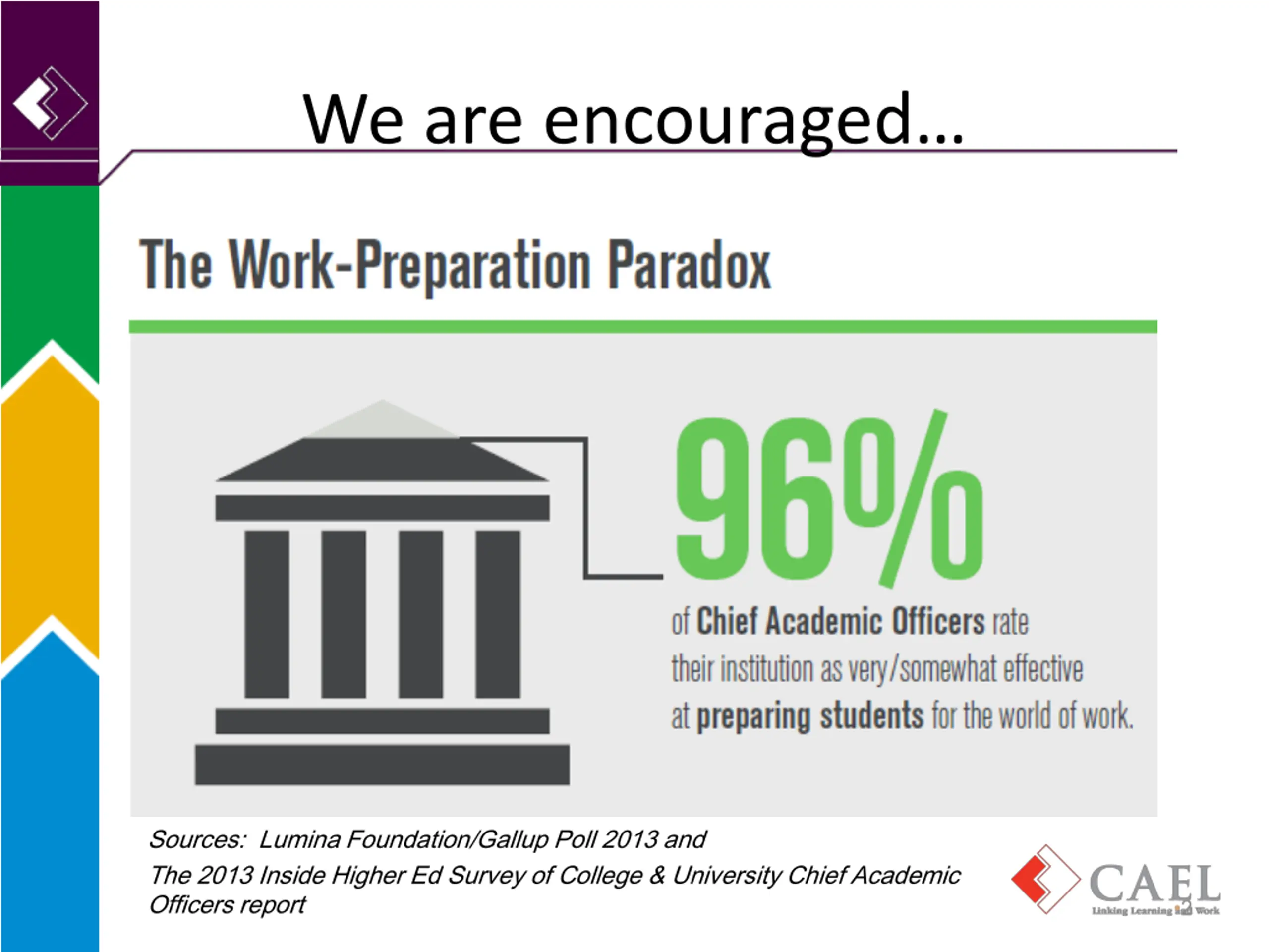 We are encouraged Sources: Lumina Foundation/Gallup Poll 2013 and The 2013 Inside Higher Ed Survey of College & University Chief Academic Officers report 2