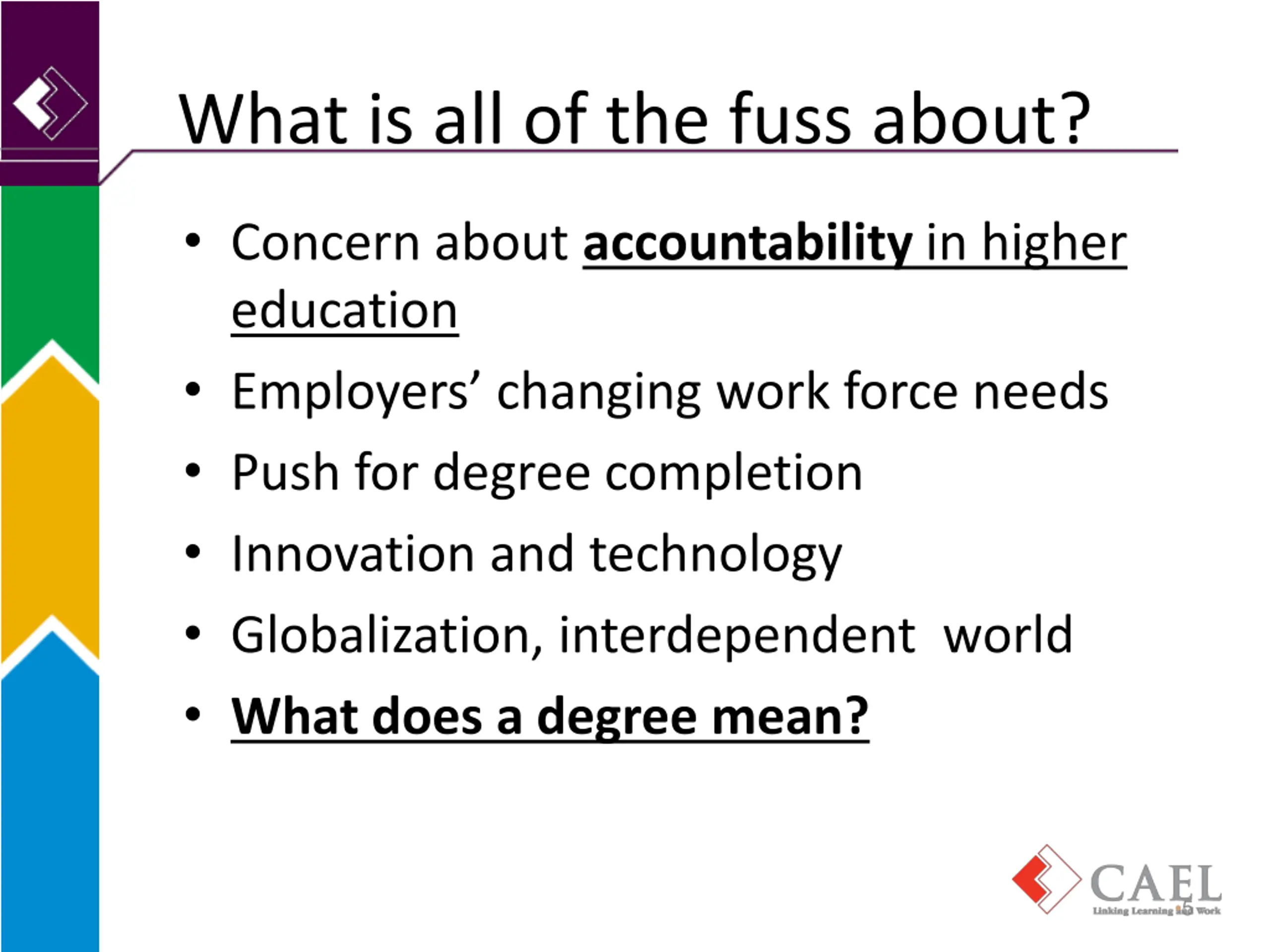 What is all of the fuss about? Concern about accountability in higher education Employers changing work force needs Push for degree completion Innovation and technology Globalization, interdependent world What does a degree mean? 5