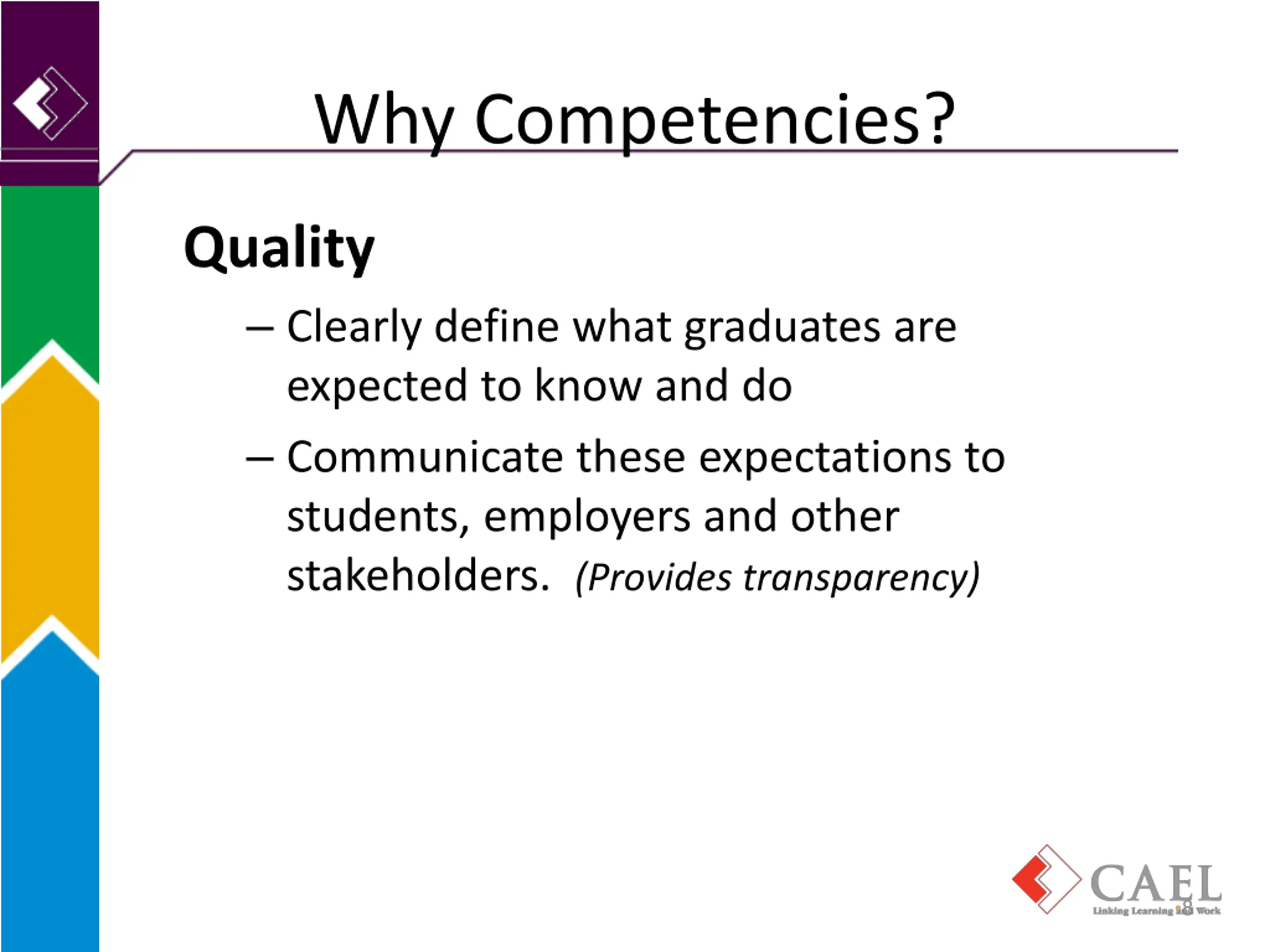 Why Competencies? Quality Clearly define what graduates are expected to know and do Communicate these expectations to students, employers and other stakeholders. (Provides transparency) 8
