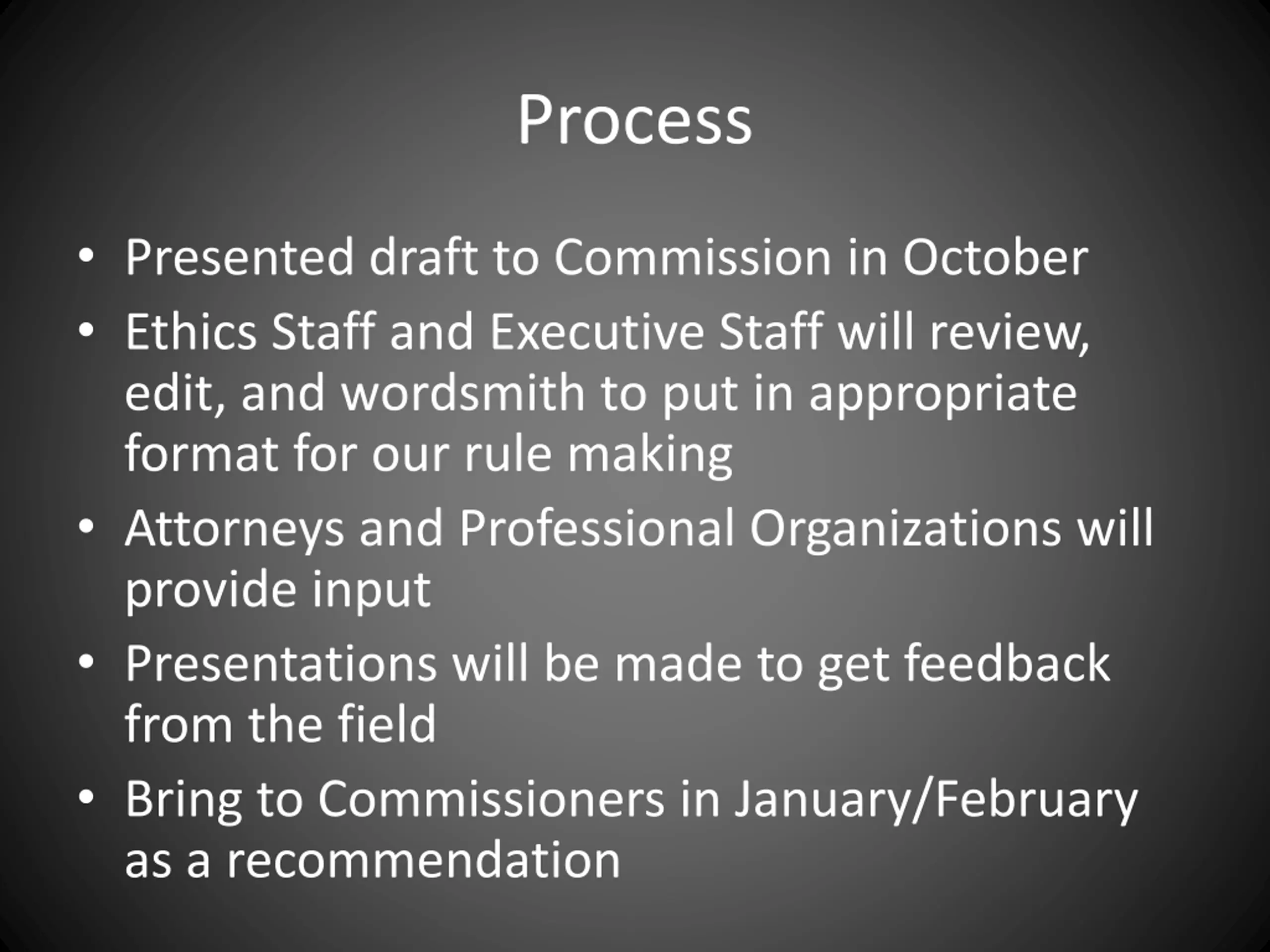 Process Presented draft to Commission in October Ethics Staff and Executive Staff will review, edit, and wordsmith to put in appropriate format for our rule making Attorneys and Professional Organizations will provide input Presentations will be made to get feedback from the field Bring to Commissioners in January/February as a recommendation