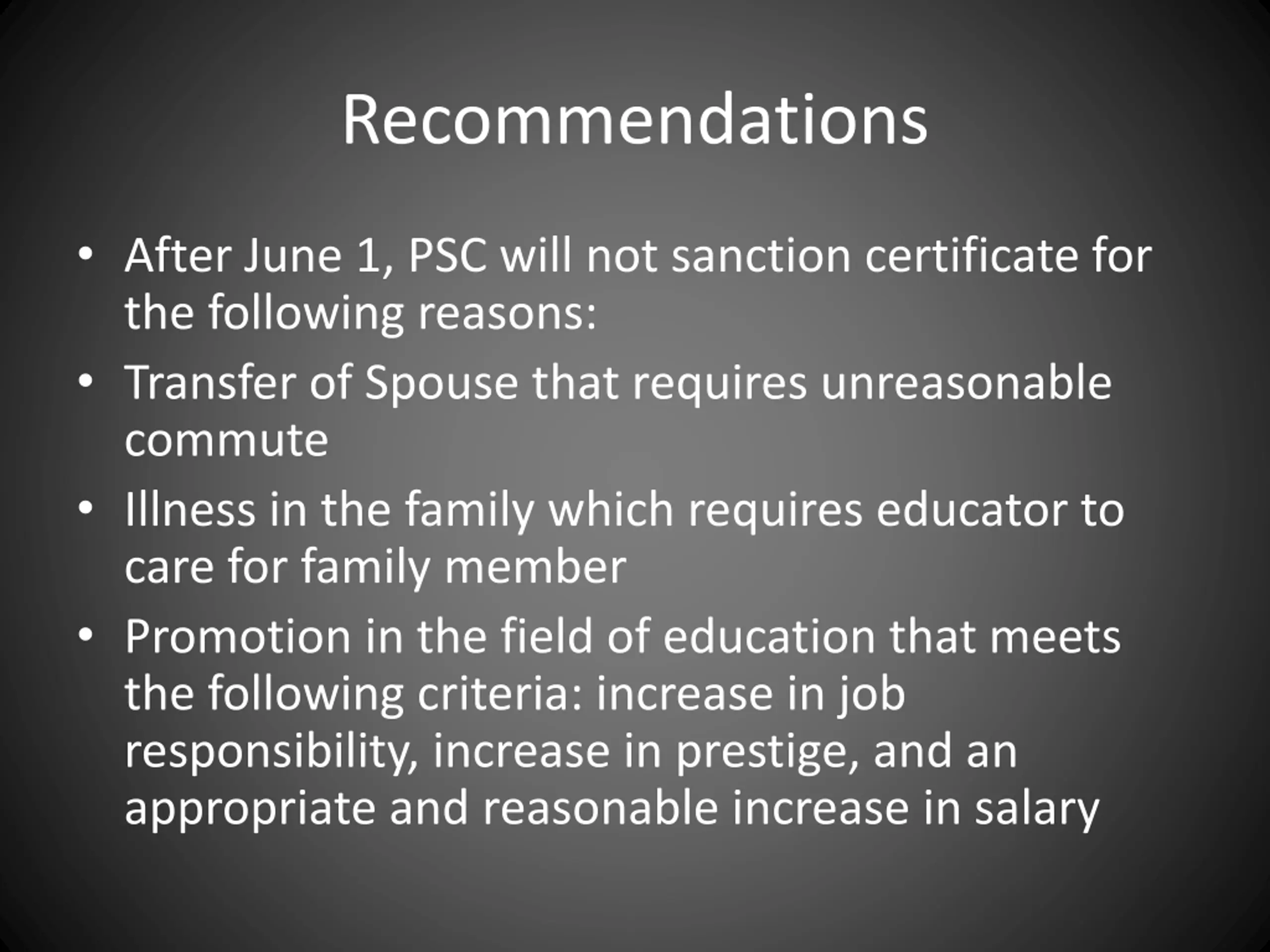 Recommendations After June 1, PSC will not sanction certificate for the following reasons: Transfer of Spouse that requires unreasonable commute Illness in the family which requires educator to care for family member Promotion in the field of education that meets the following criteria: increase in job responsibility, increase in prestige, and an appropriate and reasonable increase in salary