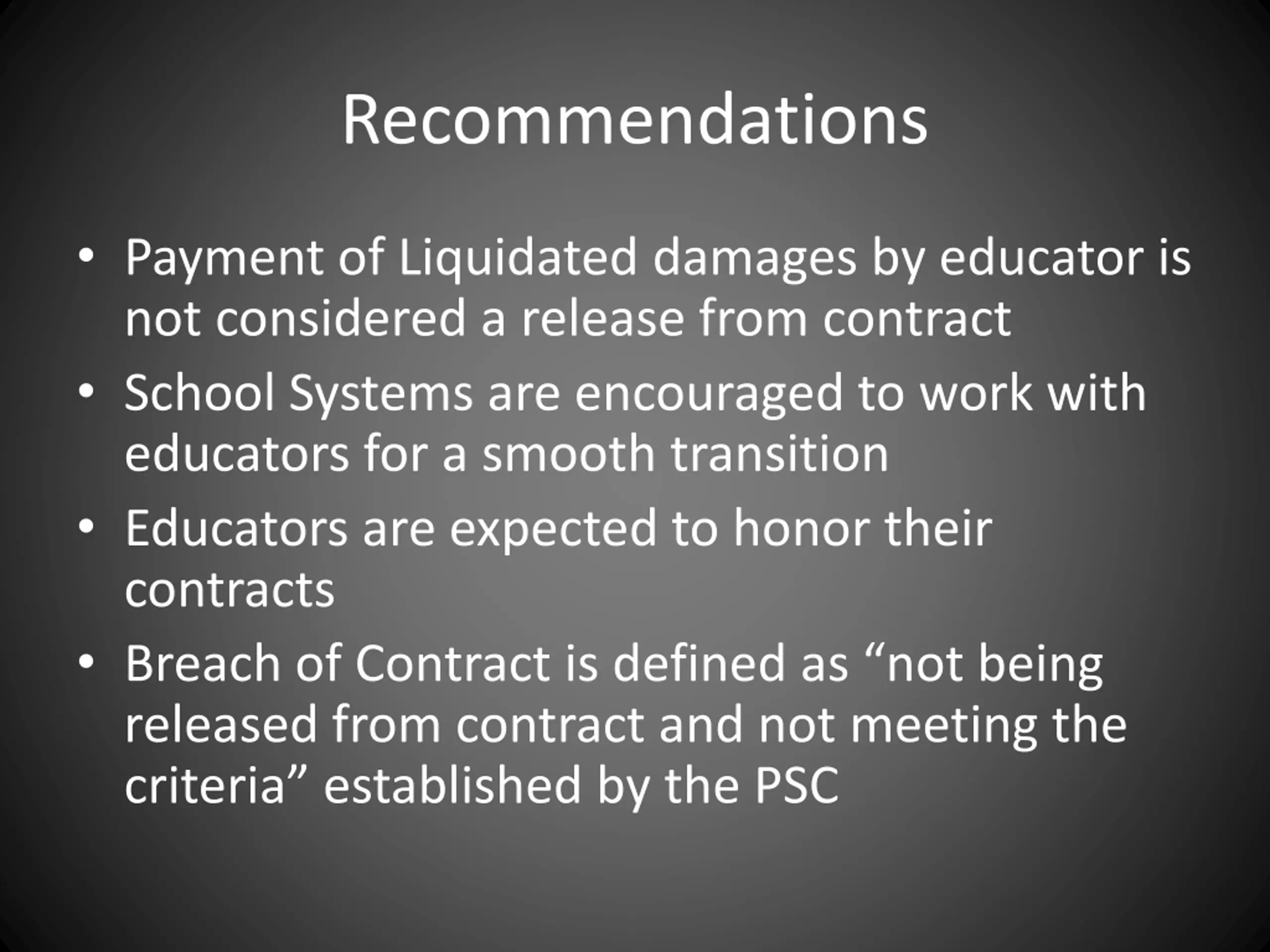 Recommendations Payment of Liquidated damages by educator is not considered a release from contract School Systems are encouraged to work with educators for a smooth transition Educators are expected to honor their contracts Breach of Contract is defined as not being released from contract and not meeting the criteria established by the PSC