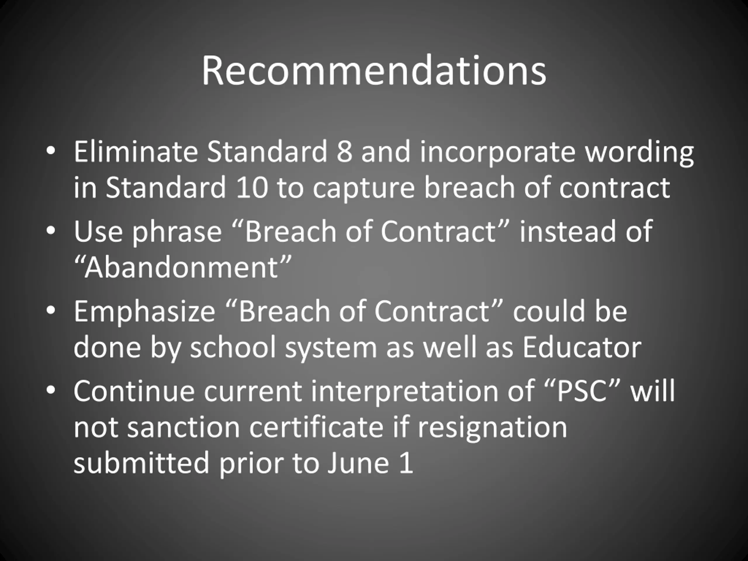 Recommendations Eliminate Standard 8 and incorporate wording in Standard 10 to capture breach of contract Use phrase Breach of Contract instead of Abandonment Emphasize Breach of Contract could be done by school system as well as Educator Continue current interpretation of PSC will not sanction certificate if resignation submitted prior to June 1