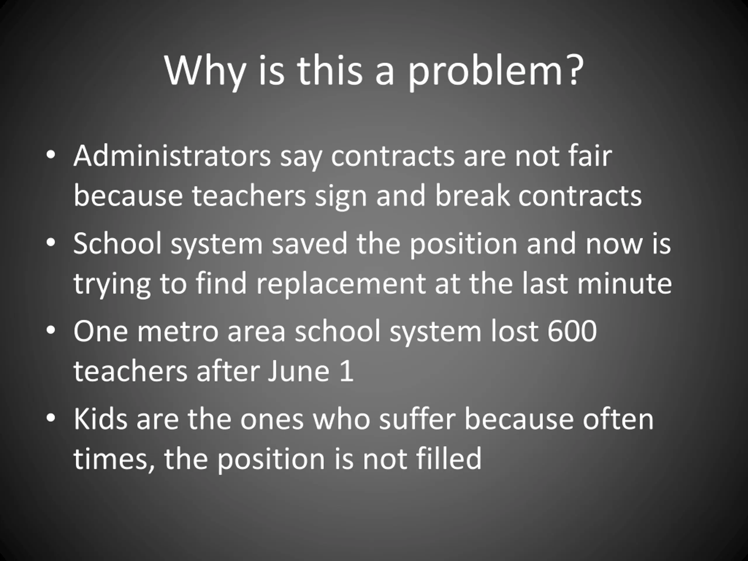 Why is this a problem? Administrators say contracts are not fair because teachers sign and break contracts School system saved the position and now is trying to find replacement at the last minute One metro area school system lost 600 teachers after June 1 Kids are the ones who suffer because often times, the position is not filled