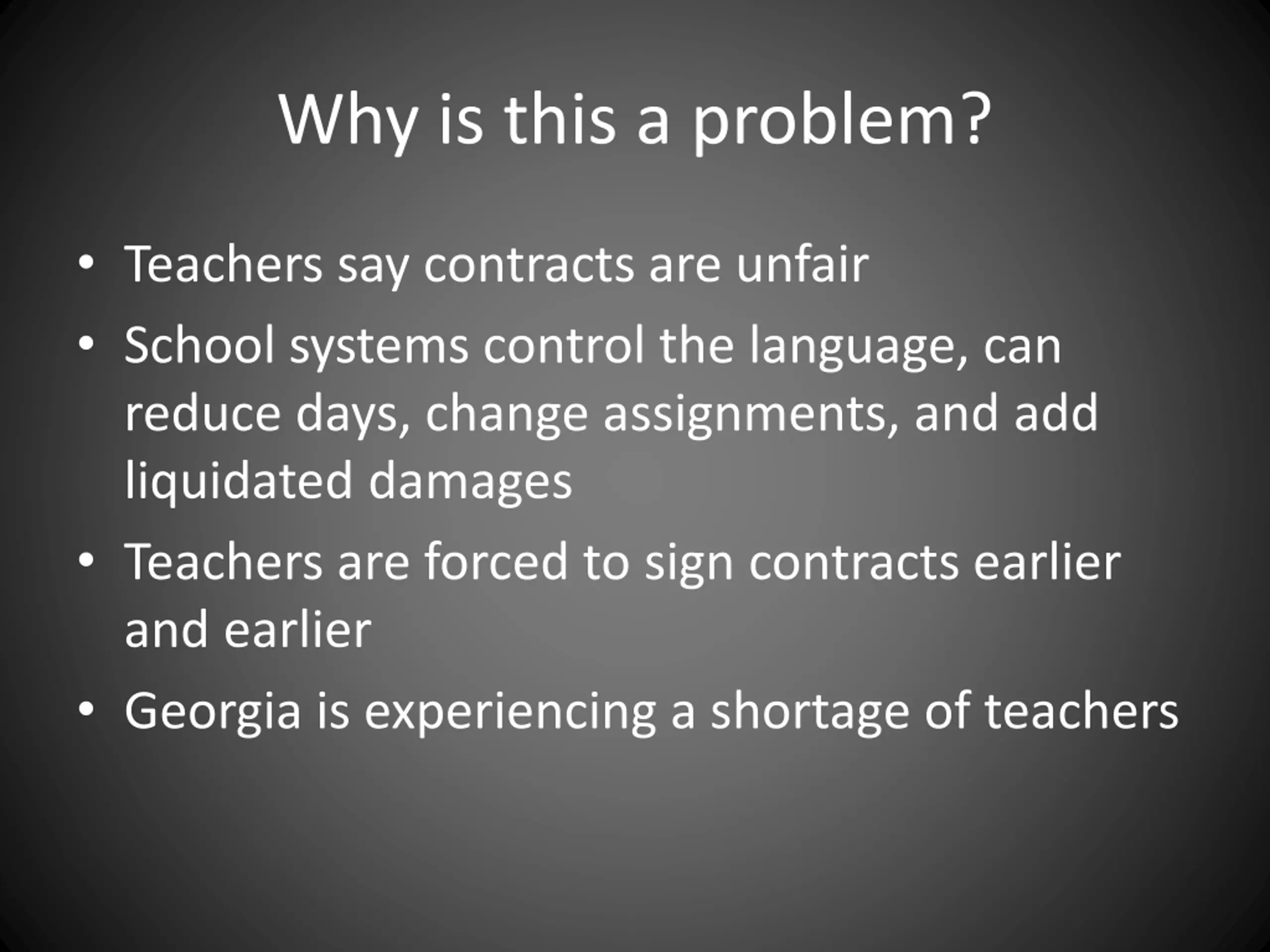 Why is this a problem? Teachers say contracts are unfair School systems control the language, can reduce days, change assignments, and add liquidated damages Teachers are forced to sign contracts earlier and earlier Georgia is experiencing a shortage of teachers
