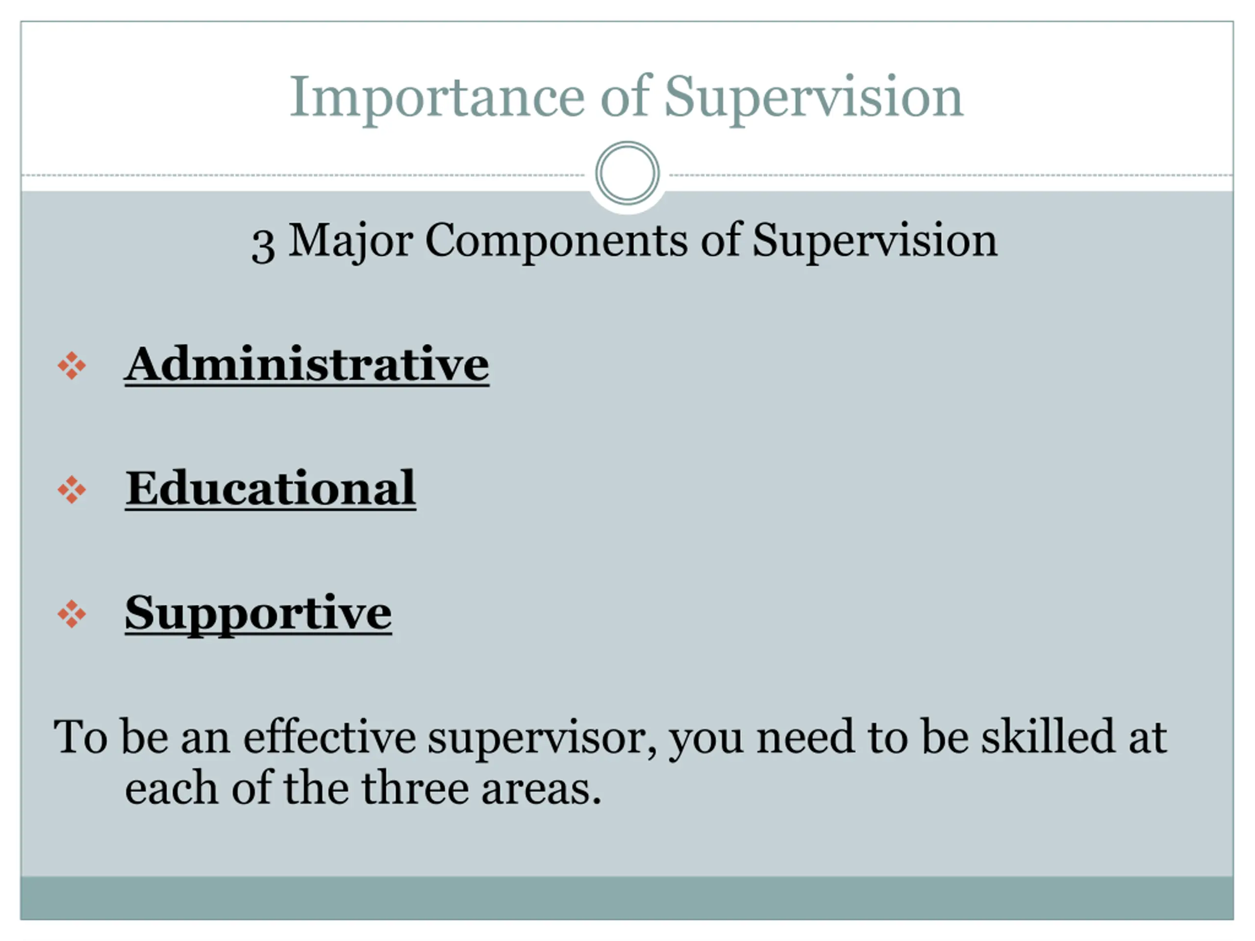 Importance of Supervision 3 Major Components of Supervision Administrative Educational Supportive To be an effective supervisor, you need to be skilled at each of the three areas.