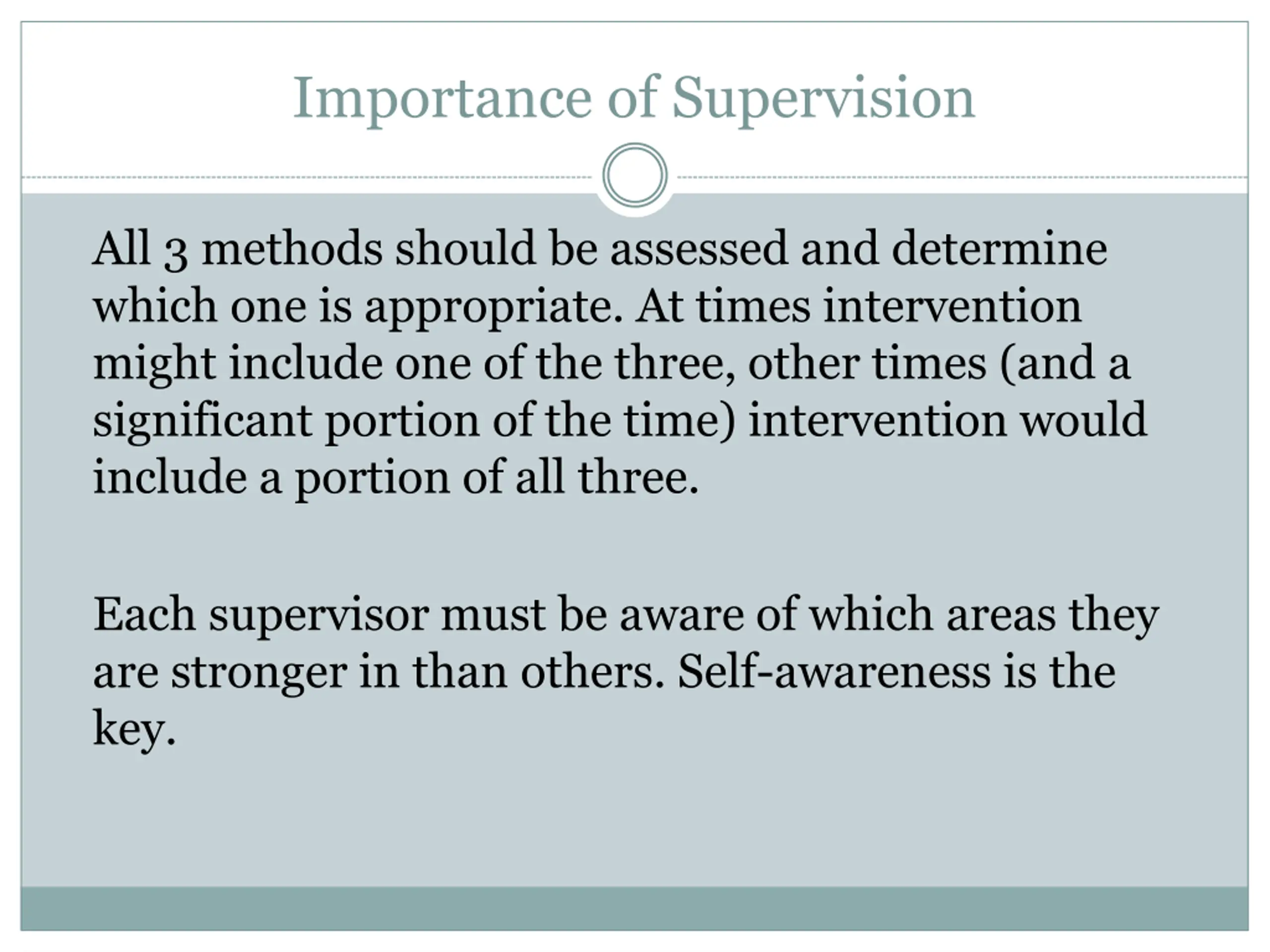 Importance of Supervision All 3 methods should be assessed and determine which one is appropriate. At times intervention might include one of the three, other times (and a significant portion of the time) intervention would include a portion of all three. Each supervisor must be aware of which areas they are stronger in than others. Self-awareness is the key.