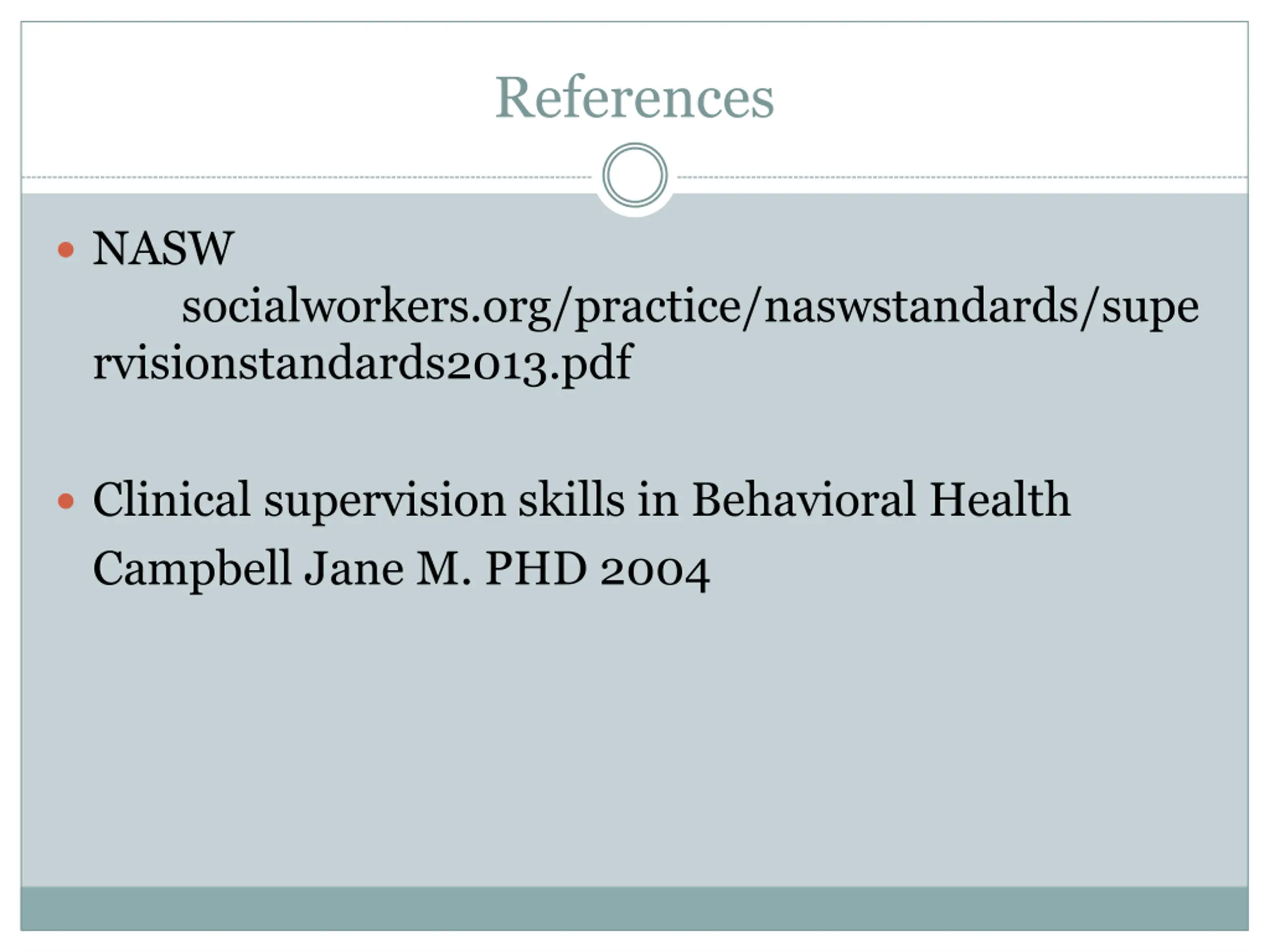 References NASW socialworkers.org/practice/naswstandards/supe rvisionstandards2013.pdf Clinical supervision skills in Behavioral Health Campbell Jane M. PHD 2004