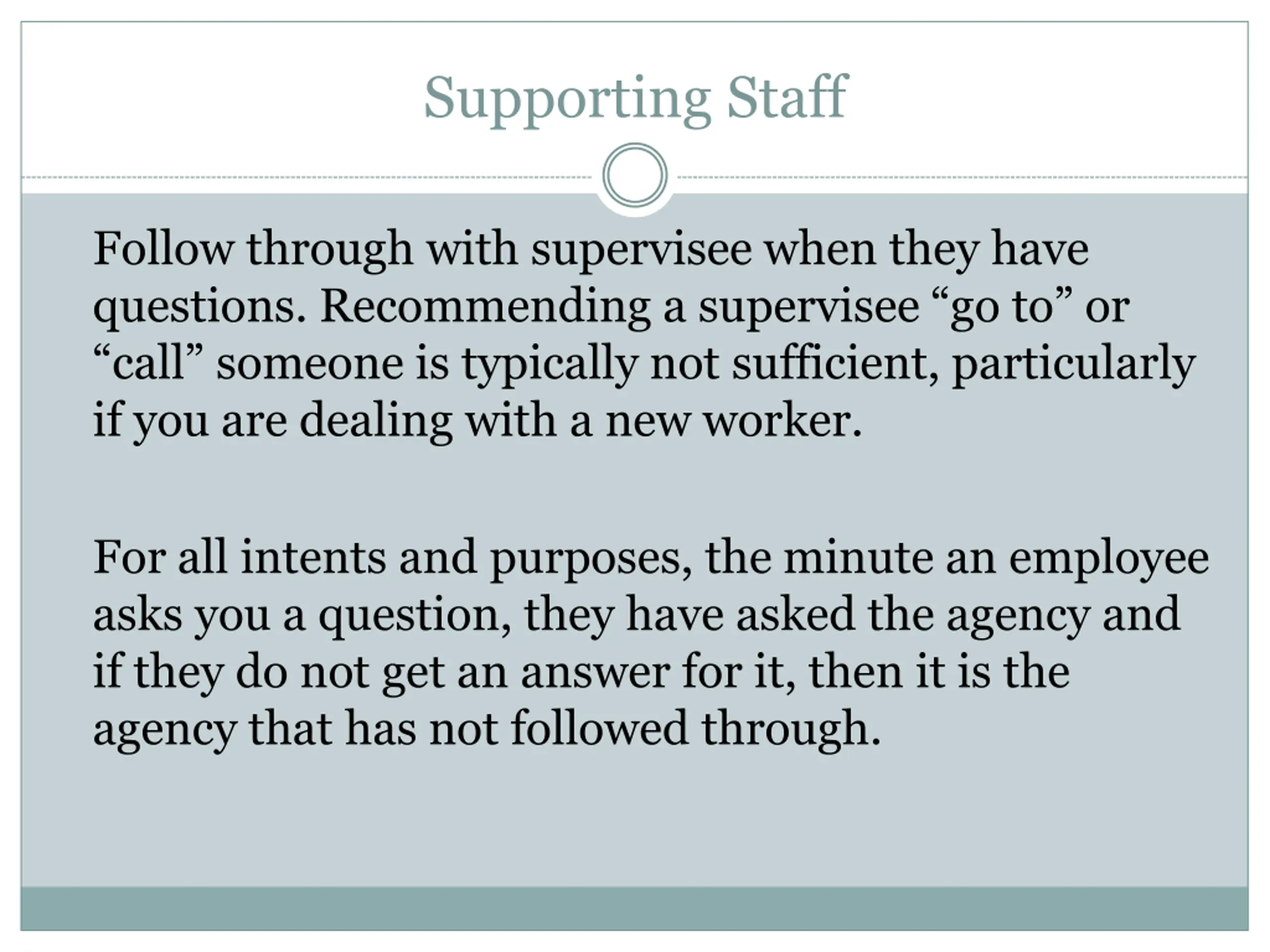 Supporting Staff Follow through with supervisee when they have questions. Recommending a supervisee go to or call someone is typically not sufficient, particularly if you are dealing with a new worker. For all intents and purposes, the minute an employee asks you a question, they have asked the agency and if they do not get an answer for it, then it is the agency that has not followed through.
