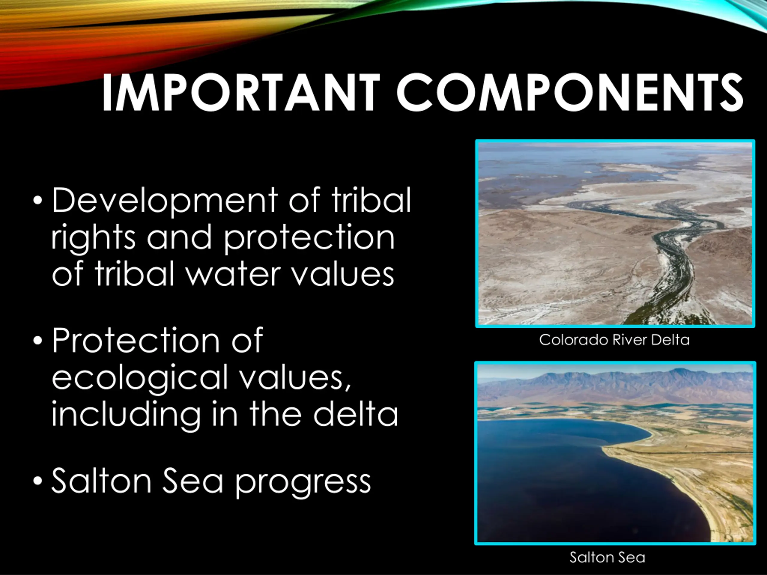 IMPORTANT COMPONENTS Development of tribal rights and protection of tribal water values Protection of ecological values, including in the delta Colorado River Delta Salton Sea progress Salton Sea
