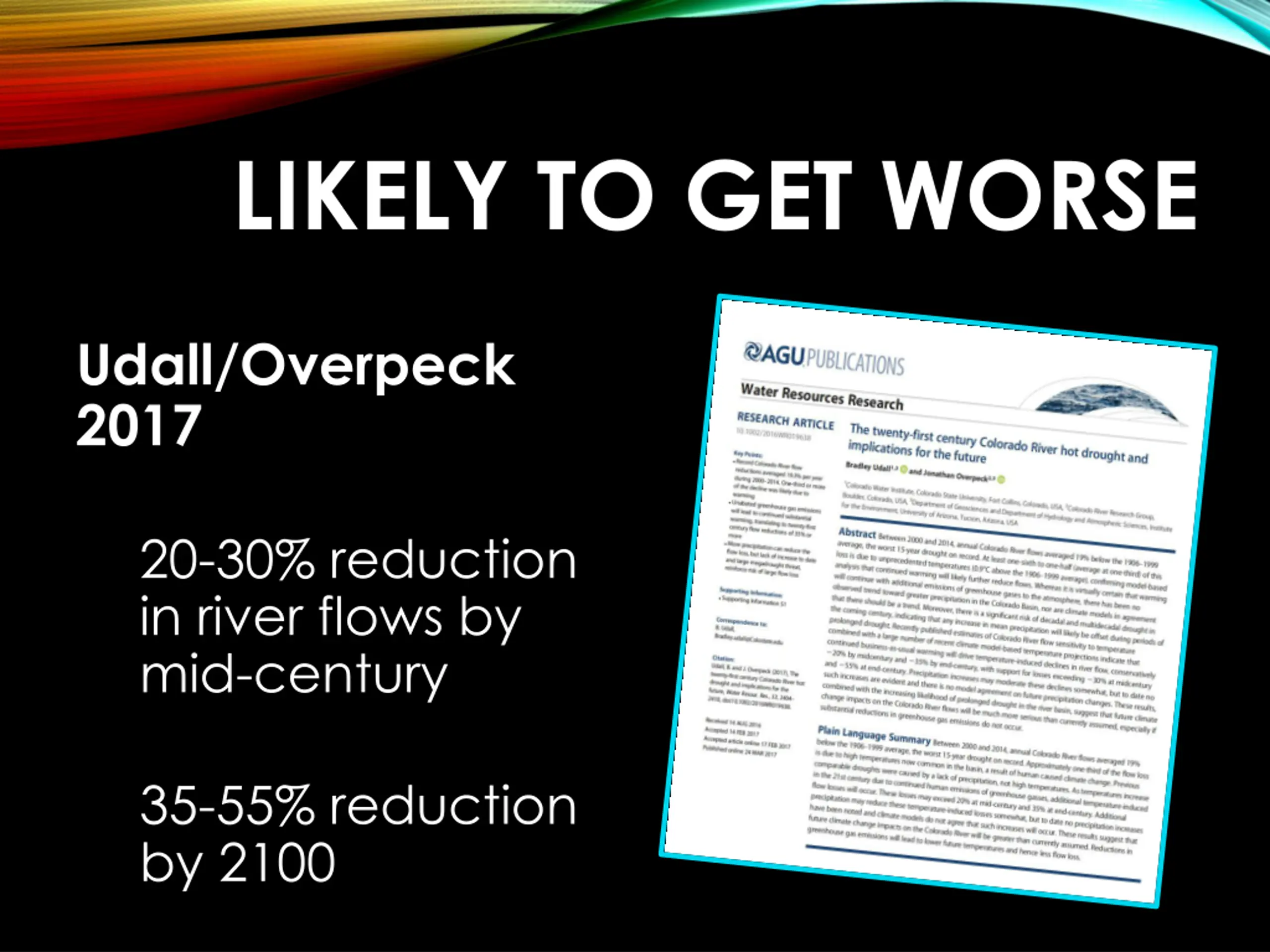 LIKELY TO GET WORSE Udall/Overpeck 2017 20-30% reduction in river flows by mid-century 35-55% reduction by 2100