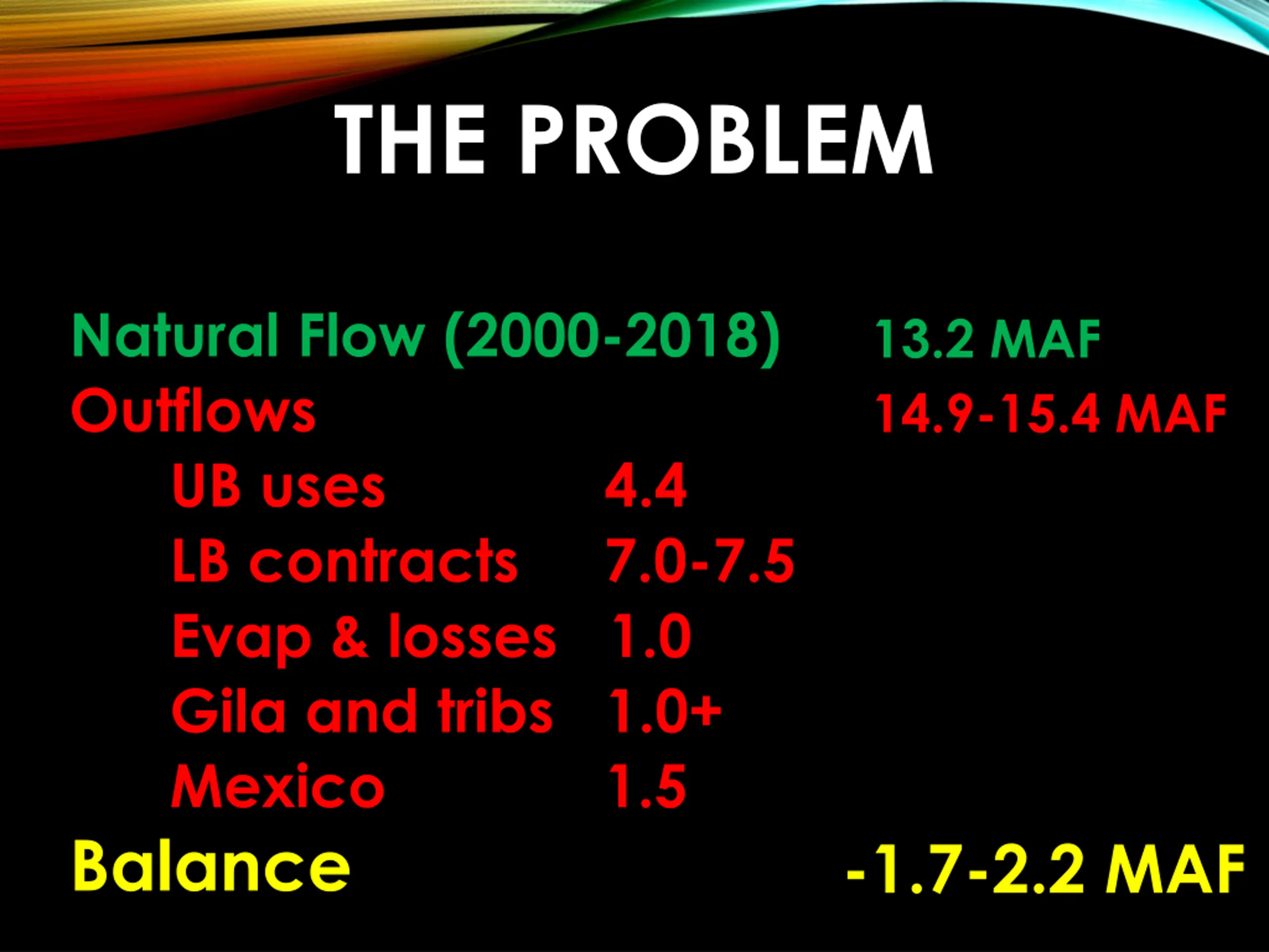 THE PROBLEM Natural Flow (2000-2018) Outflows UB uses 4.4 LB contracts 7.0-7.5 Evap & losses 1.0 Gila and tribs 1.0+ Mexico 1.5 Balance 13.2 MAF 14.9-15.4 MAF -1.7-2.2 MAF