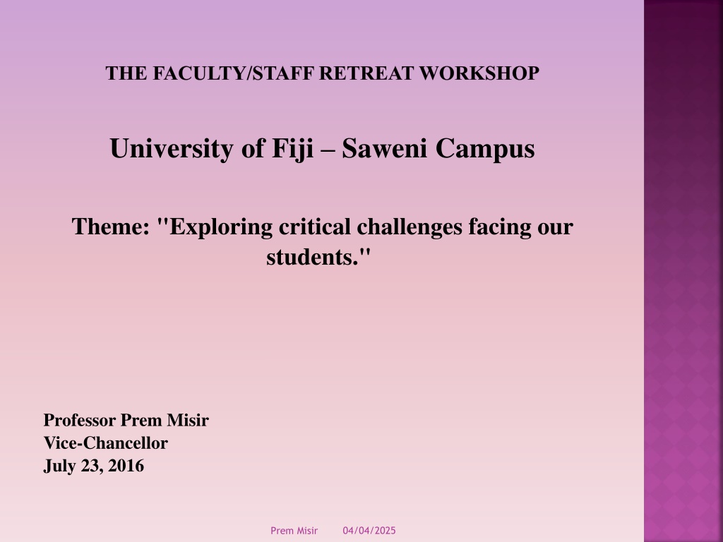 THE FACULTY/STAFF RETREAT WORKSHOP University of Fiji Saweni Campus Theme: "Exploring critical challenges facing our students." Professor Prem Misir Vice-Chancellor July 23, 2016 04/04/2025 Prem Misir