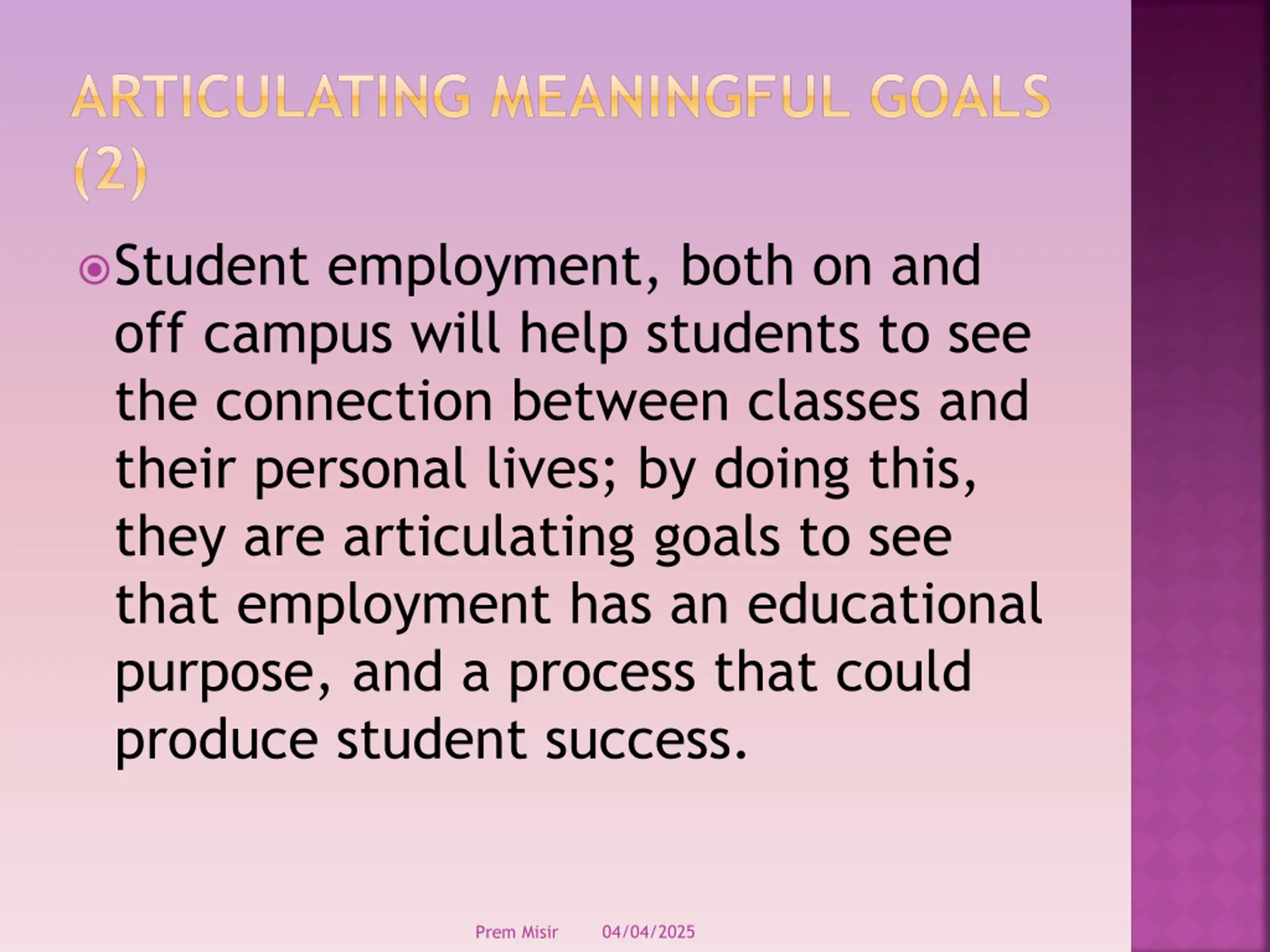ARTICULATING MEANINGFUL GOALS (2) Student employment, both on and off campus will help students to see the connection between classes and their personal lives; by doing this, they are articulating goals to see that employment has an educational purpose, and a process that could produce student success. 04/04/2025 Prem Misir