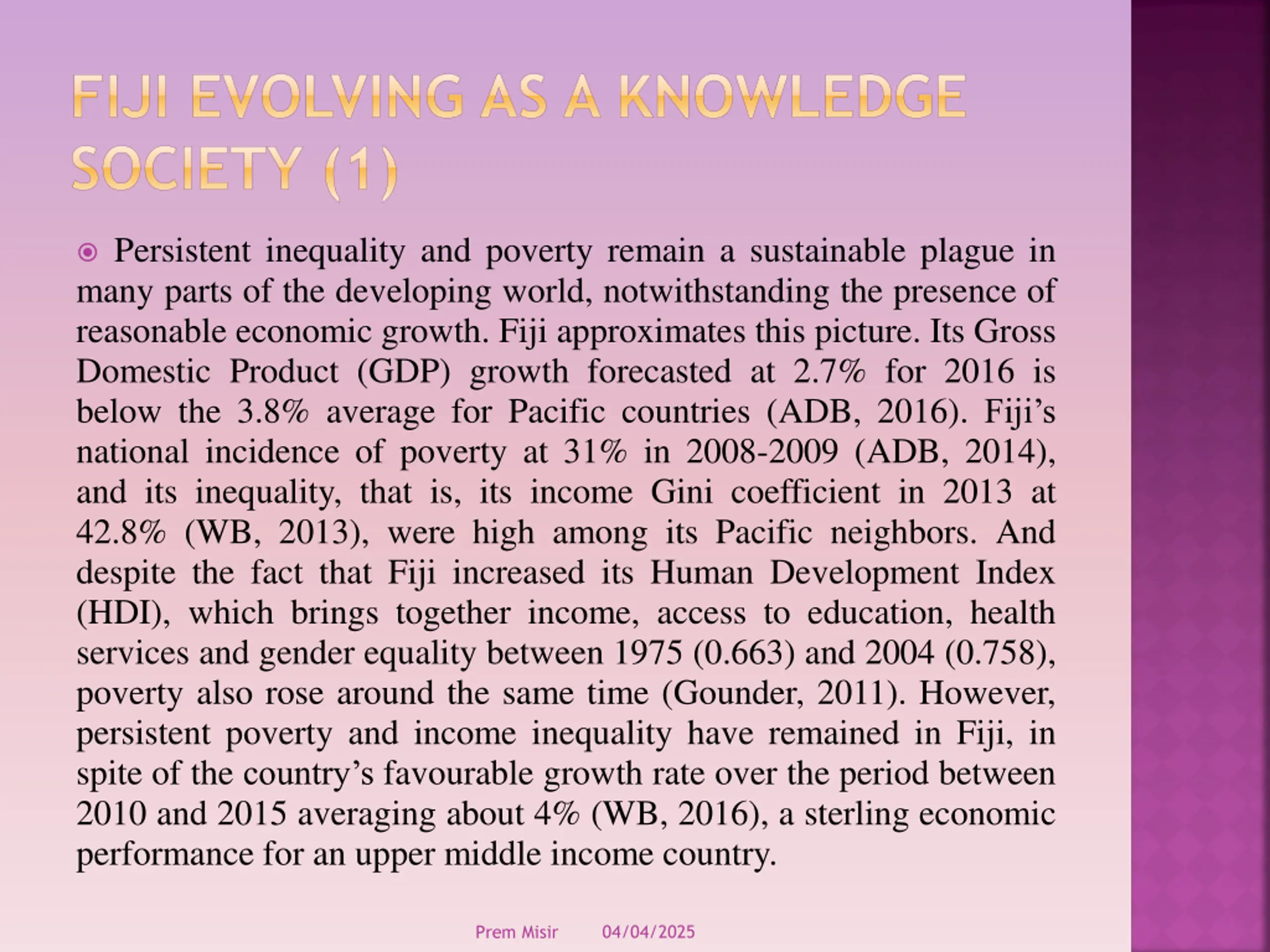 FIJI EVOLVING AS A KNOWLEDGE SOCIETY (1) Persistent inequality and poverty remain a sustainable plague in many parts of the developing world, notwithstanding the presence of reasonable economic growth. Fiji approximates this picture. Its Gross Domestic Product (GDP) growth forecasted at 2.7% for 2016 is below the 3.8% average for Pacific countries (ADB, 2016). Fiji s national incidence of poverty at 31% in 2008-2009 (ADB, 2014), and its inequality, that is, its income Gini coefficient in 2013 at 42.8% (WB, 2013), were high among its Pacific neighbors. And despite the fact that Fiji increased its Human Development Index (HDI), which brings together income, access to education, health services and gender equality between 1975 (0.663) and 2004 (0.758), poverty also rose around the same time (Gounder, 2011). However, persistent poverty and income inequality have remained in Fiji, in spite of the country s favourable growth rate over the period between 2010 and 2015 averaging about 4% (WB, 2016), a sterling economic performance for an upper middle income country. 04/04/2025 Prem Misir