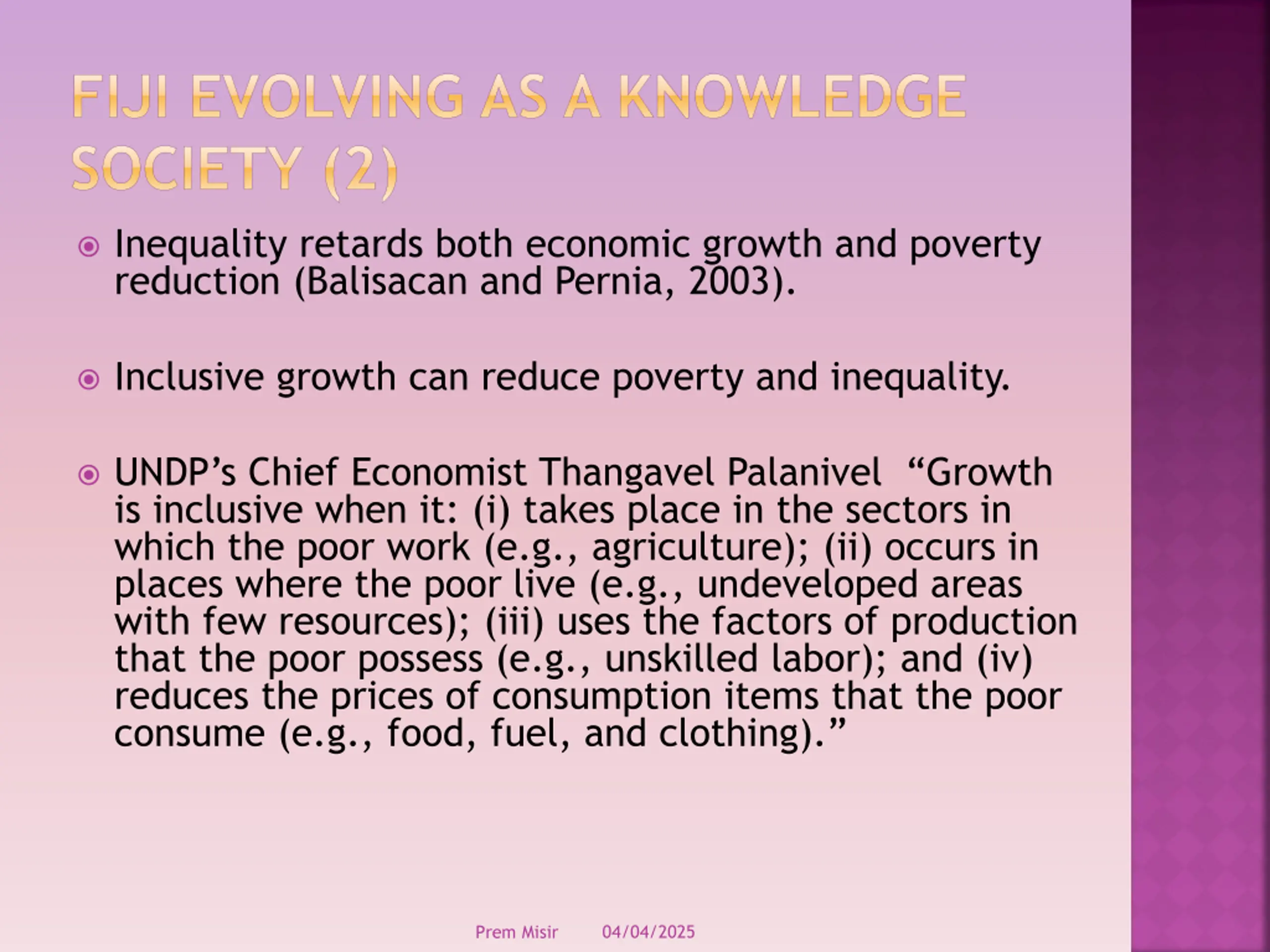 FIJI EVOLVING AS A KNOWLEDGE SOCIETY (2) Inequality retards both economic growth and poverty reduction (Balisacan and Pernia, 2003). Inclusive growth can reduce poverty and inequality. UNDP s Chief Economist Thangavel Palanivel Growth is inclusive when it: (i) takes place in the sectors in which the poor work (e.g., agriculture); (ii) occurs in places where the poor live (e.g., undeveloped areas with few resources); (iii) uses the factors of production that the poor possess (e.g., unskilled labor); and (iv) reduces the prices of consumption items that the poor consume (e.g., food, fuel, and clothing). 04/04/2025 Prem Misir