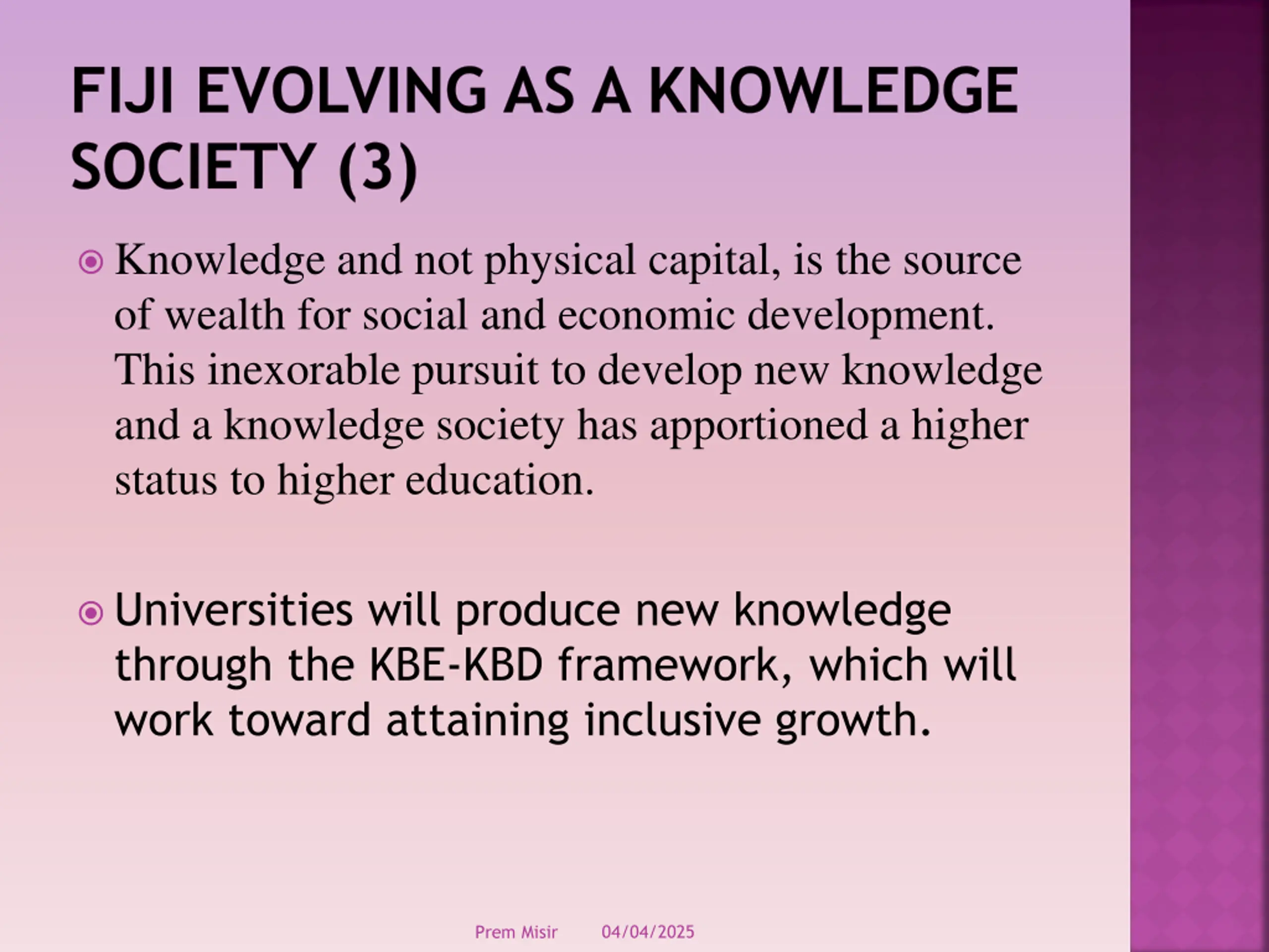 FIJI EVOLVING AS A KNOWLEDGE SOCIETY (3) Knowledge and not physical capital, is the source of wealth for social and economic development. This inexorable pursuit to develop new knowledge and a knowledge society has apportioned a higher status to higher education. Universities will produce new knowledge through the KBE-KBD framework, which will work toward attaining inclusive growth. 04/04/2025 Prem Misir