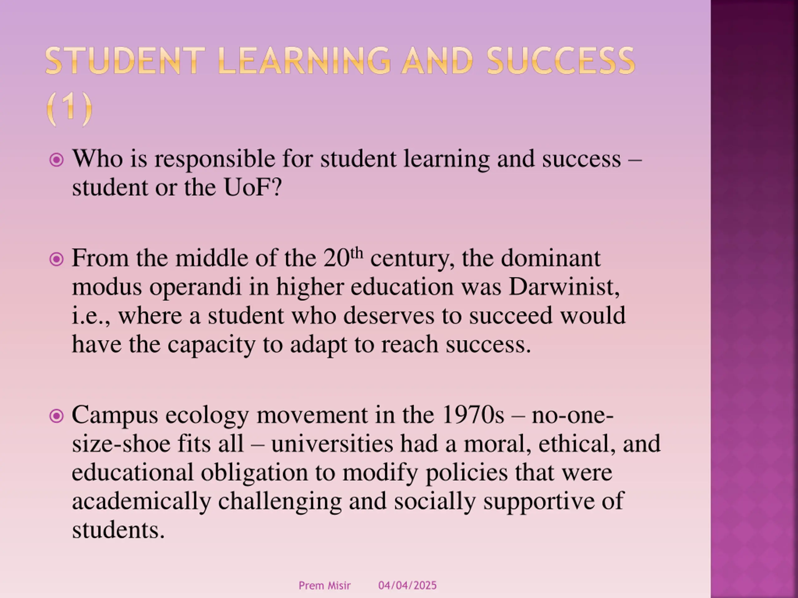 STUDENT LEARNING AND SUCCESS (1) Who is responsible for student learning and success student or the UoF? From the middle of the 20th century, the dominant modus operandi in higher education was Darwinist, i.e., where a student who deserves to succeed would have the capacity to adapt to reach success. Campus ecology movement in the 1970s no-one- size-shoe fits all universities had a moral, ethical, and educational obligation to modify policies that were academically challenging and socially supportive of students. 04/04/2025 Prem Misir