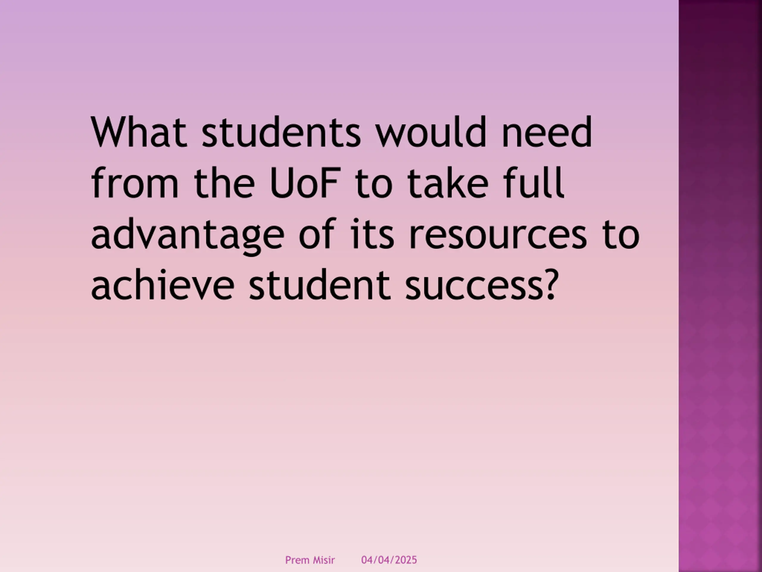 What students would need from the UoF to take full advantage of its resources to achieve student success? 04/04/2025 Prem Misir