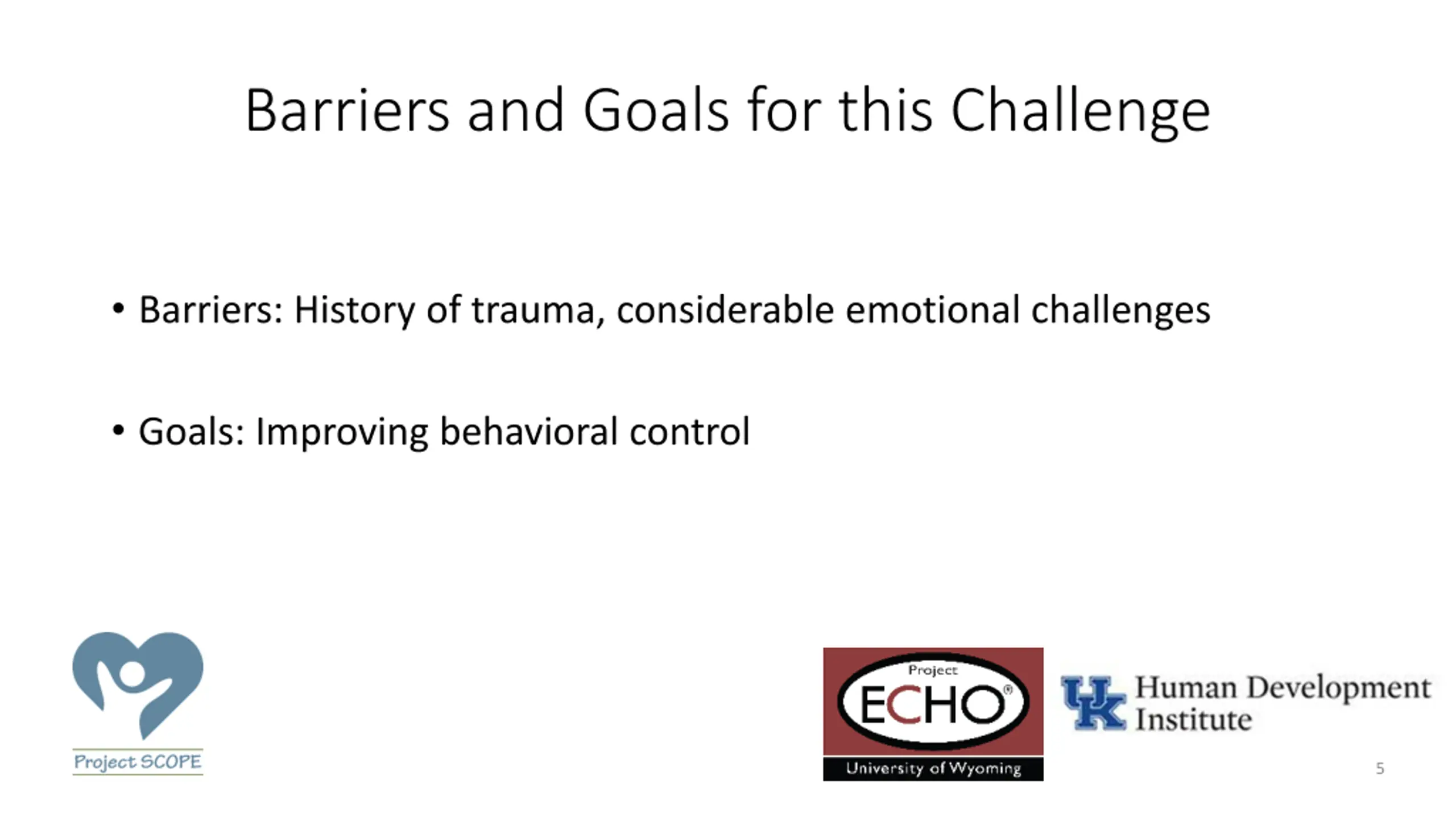 Barriers and Goals for this Challenge Barriers: History of trauma, considerable emotional challenges Goals: Improving behavioral control 5