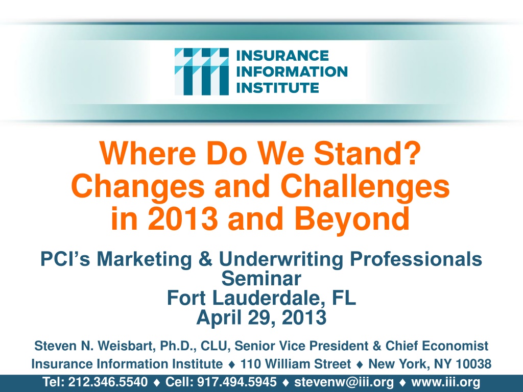 Where Do We Stand? Changes and Challenges in 2013 and Beyond PCI s Marketing & Underwriting Professionals Seminar Fort Lauderdale, FL April 29, 2013 Steven N. Weisbart, Ph.D., CLU, Senior Vice President & Chief Economist Insurance Information Institute 110 William Street New York, NY 10038 Tel: 212.346.5540 Cell: 917.494.5945 stevenw@iii.org www.iii.org