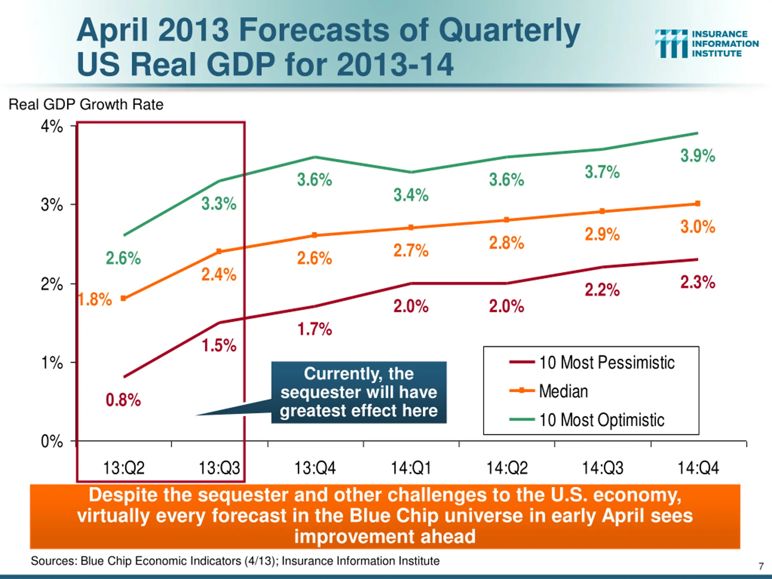 April 2013 Forecasts of Quarterly US Real GDP for 2013-14 Real GDP Growth Rate 4% 3.9% 3.7% 3.6% 3.6% 3.4% 3.3% 3% 3.0% 2.9% 2.8% 2.7% 2.6% 2.6% 2.4% 2.3% 2% 2.2% 1.8% 2.0% 2.0% 1.7% 1.5% 1% 10 Most Pessimistic Median 10 Most Optimistic Currently, the sequester will have greatest effect here 0.8% 0% 13:Q2 Despite the sequester and other challenges to the U.S. economy, virtually every forecast in the Blue Chip universe in early April sees improvement ahead 13:Q3 13:Q4 14:Q1 14:Q2 14:Q3 14:Q4 Sources: Blue Chip Economic Indicators (4/13); Insurance Information Institute 7
